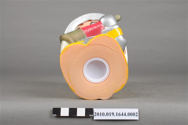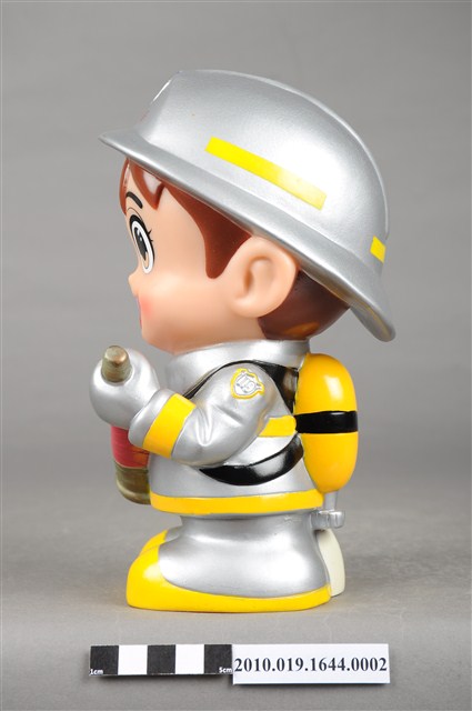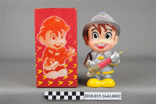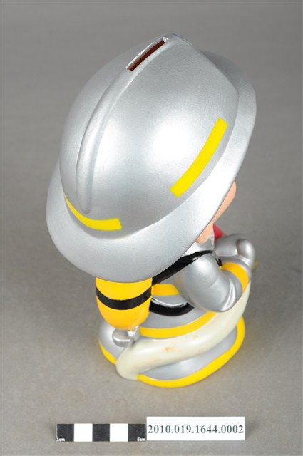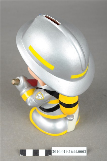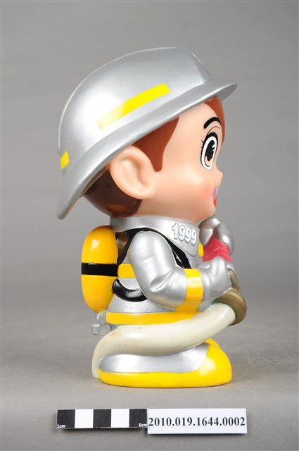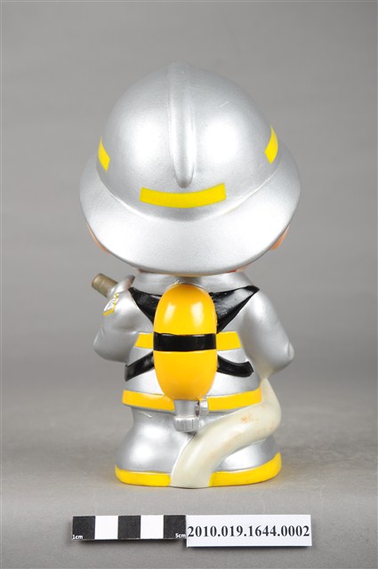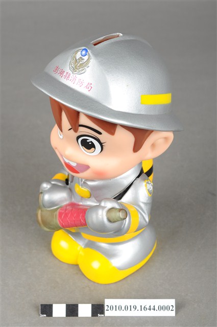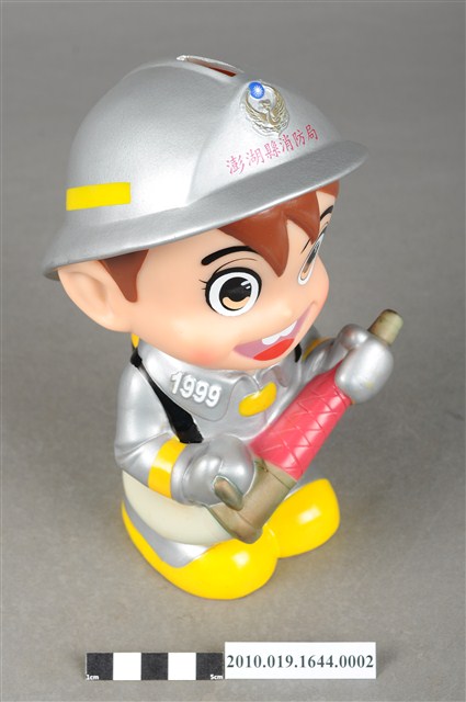 1.本物件為澎湖縣消防寶寶造型存錢筒,身穿銀色頭盔、消防衣與靴子的全套消防設備,手拿消防瞄。頭盔上有「澎湖縣消防局」字樣與消防標誌,右側衣領上有「1999」字樣的消防寶寶存錢筒。