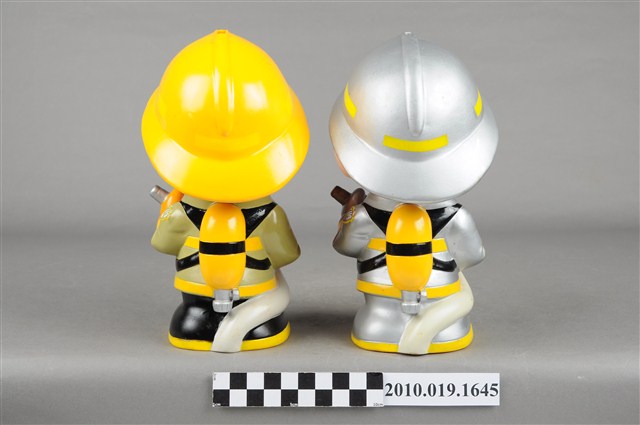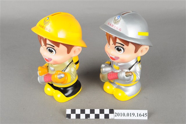 1.本物件為臺南縣消防寶寶造型存錢筒組,身穿全套消防設備,手拿消防瞄的消防寶寶存錢筒。左邊為黃色頭盔、綠色消防衣、黑色靴子,右邊為銀色頭盔、消防衣、與靴子。兩個頭盔上都有「台南縣消防局」字樣與消防標誌,右側衣領上都有「1999」字樣。