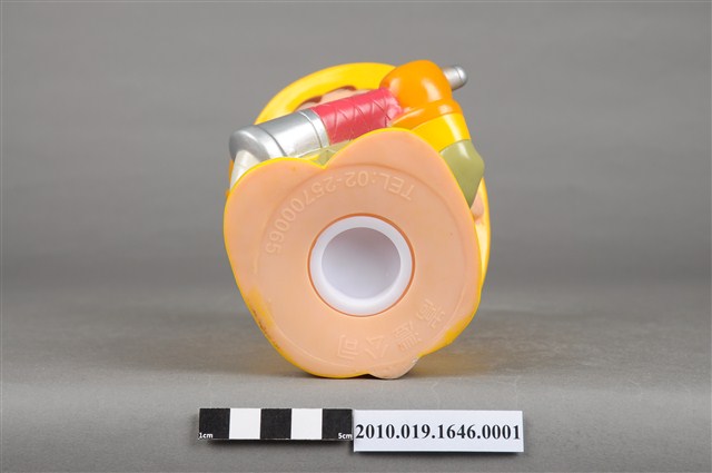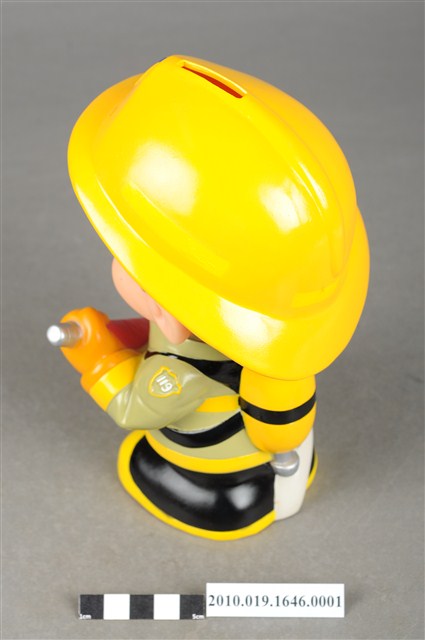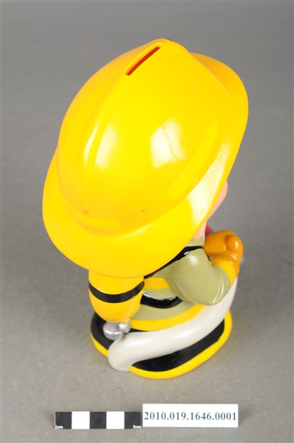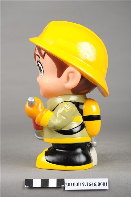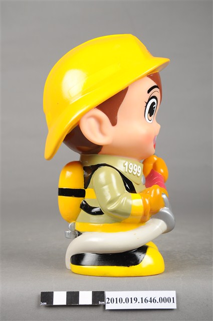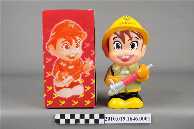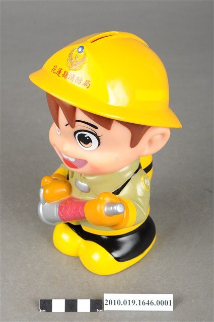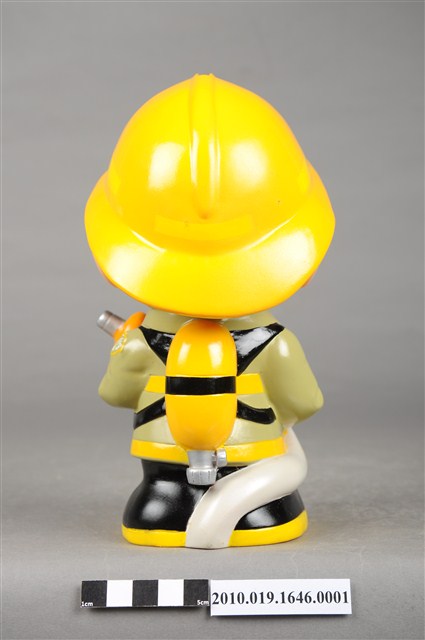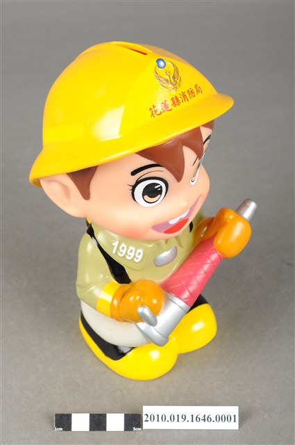 1.本物件為花蓮縣消防寶寶造型存錢筒,身穿黃色頭盔、綠色消防衣、黑色靴子的全套消防設備,手拿消防瞄,頭盔上有「花蓮縣消防局」字樣與消防標誌,右側衣領上有「1999」字樣的消防寶寶存錢筒。