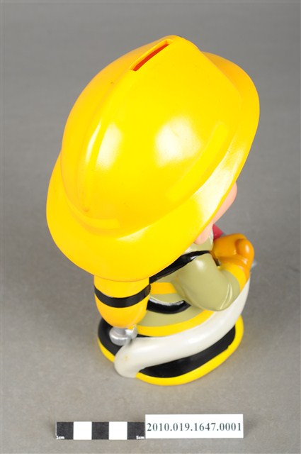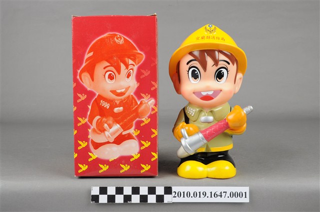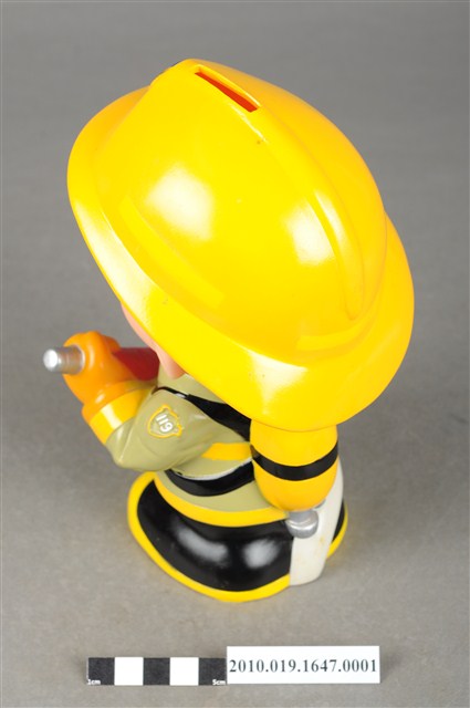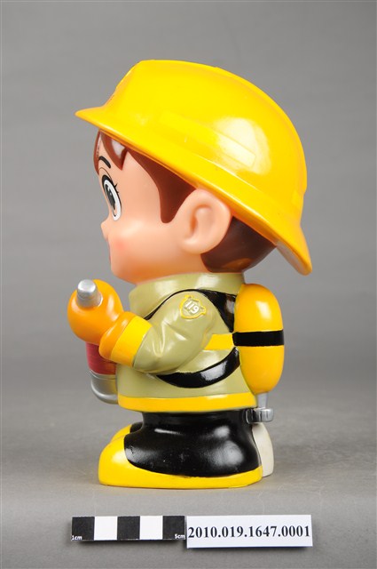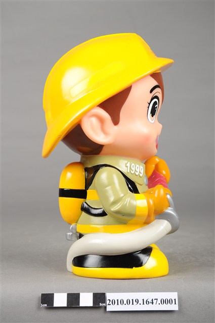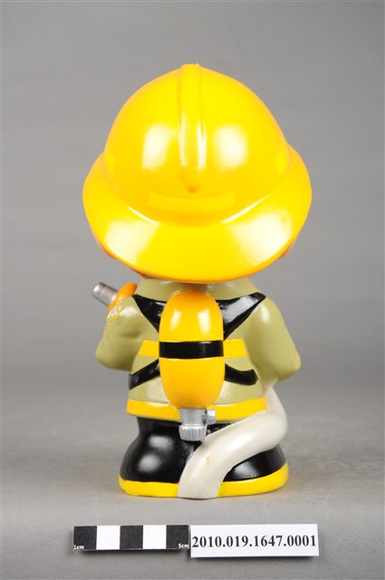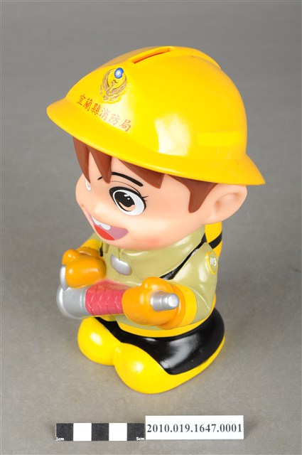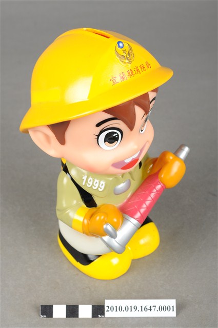 1.本物件為宜蘭縣消防寶寶造型存錢筒,身穿黃色頭盔、綠色消防衣、黑色靴子的全套消防設備,手拿消防瞄,頭盔上有「宜蘭縣消防局」字樣與消防標誌,右側衣領上有「1999」字樣的消防寶寶存錢筒。