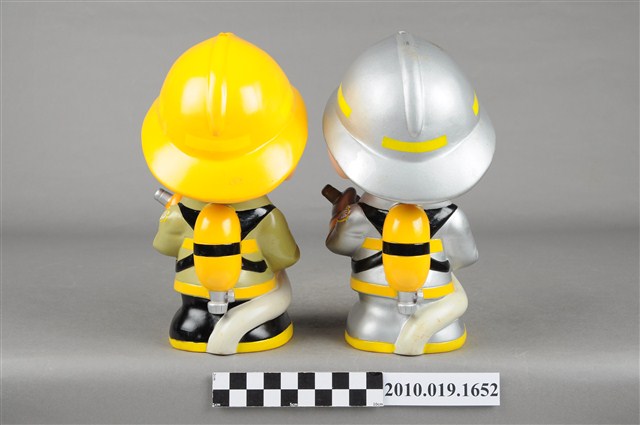 1.本物件為基隆港務局消防寶寶造型存錢筒組,身穿全套消防設備,手拿消防瞄的消防寶寶存錢筒。左邊為黃色頭盔、綠色消防衣、黑色靴子,右邊為銀色頭盔、消防衣、與靴子。兩個頭盔上都有「基隆港務消防隊」字樣與消防標誌,右側衣領上都有「1999」字樣。