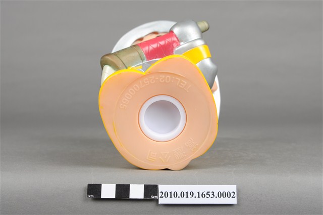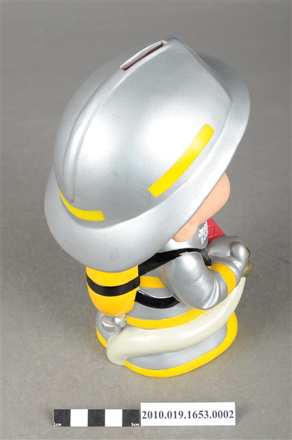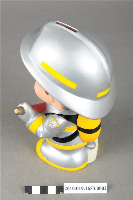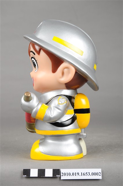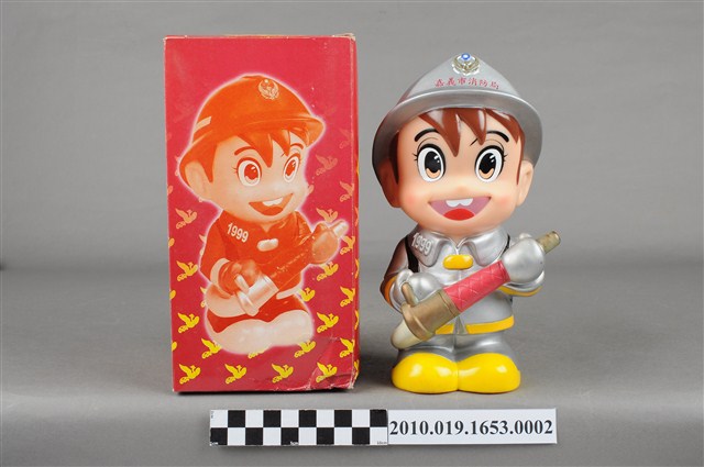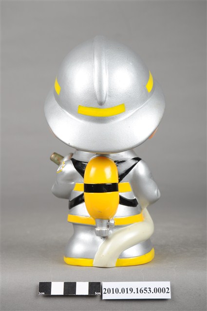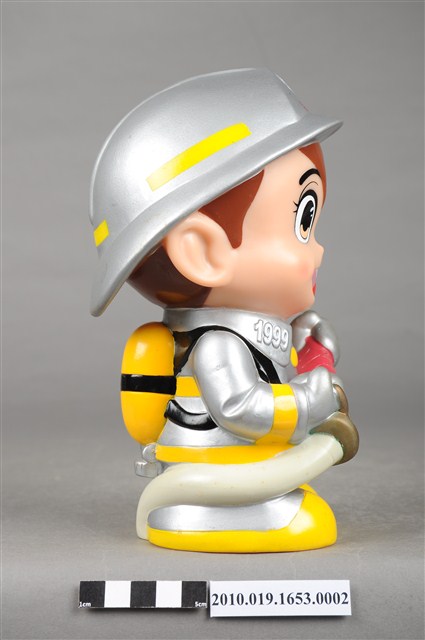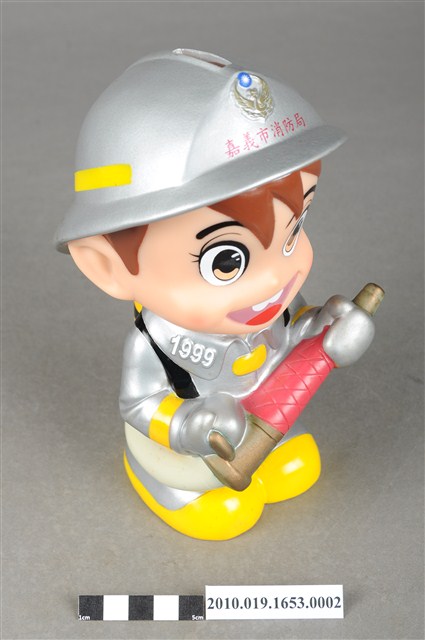 1.本物件為嘉義市消防寶寶造型存錢筒,身穿銀色頭盔、消防衣與靴子的全套消防設備,手拿消防瞄。頭盔上有「嘉義市消防局」字樣與消防標誌,右側衣領上有「1999」字樣的消防寶寶存錢筒。