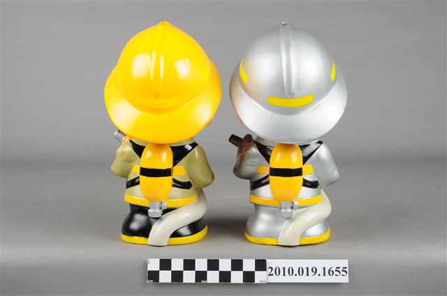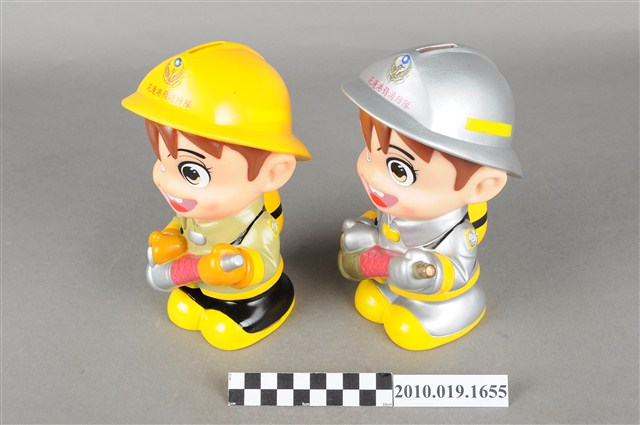 1.本物件為花蓮港務局消防寶寶造型存錢筒組,身穿全套消防設備,手拿消防瞄的消防寶寶存錢筒。左邊為黃色頭盔、綠色消防衣、黑色靴子,右邊為銀色頭盔、消防衣、與靴子。兩個頭盔上都有「花蓮港務消防隊」字樣與消防標誌,右側衣領上都有「1999」字樣。