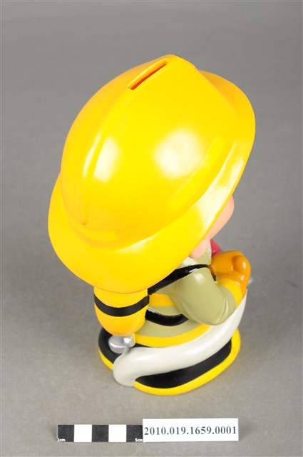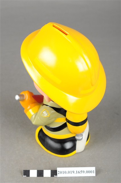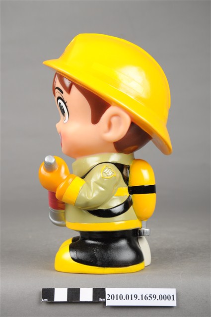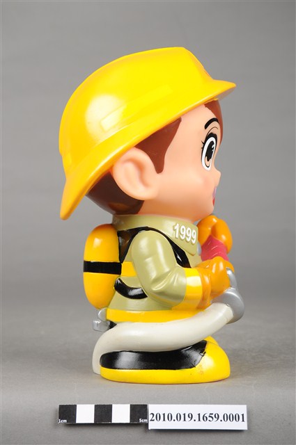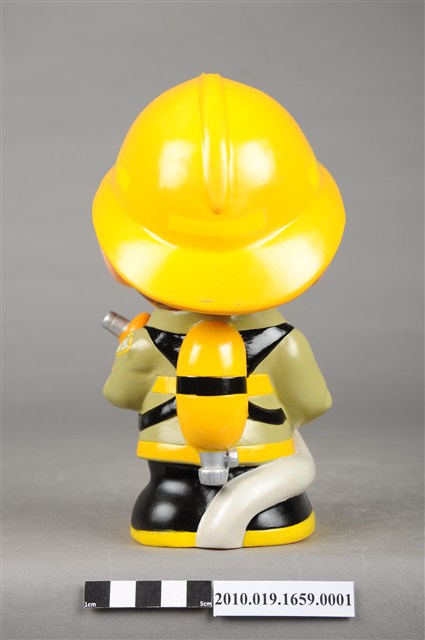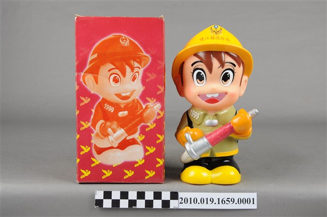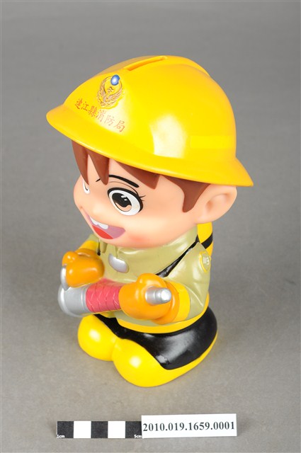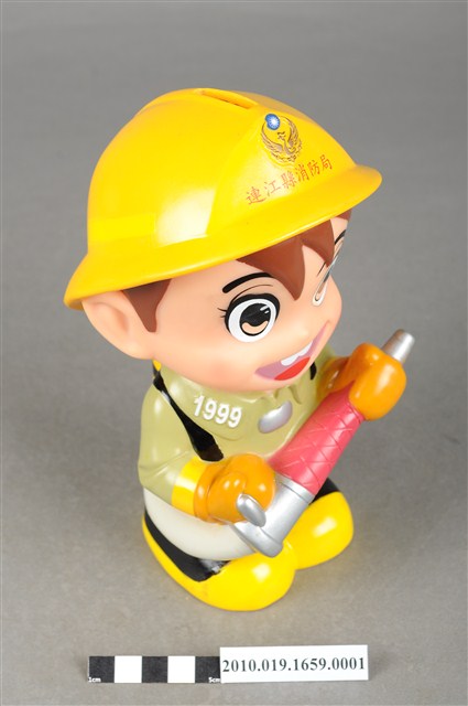 1.本物件為連江縣消防寶寶造型存錢筒,身穿黃色頭盔、綠色消防衣、黑色靴子的全套消防設備,手拿消防瞄,頭盔上有「連江縣消防局」字樣與消防標誌,右側衣領上有「1999」字樣的消防寶寶存錢筒。