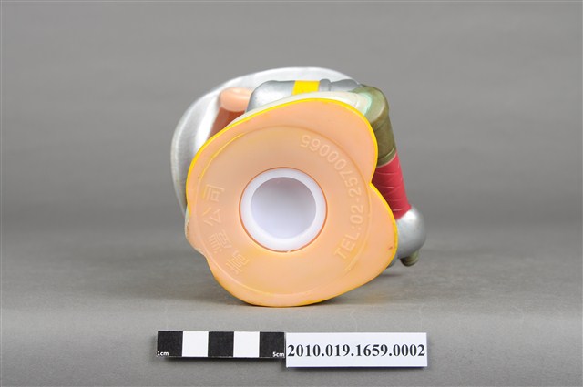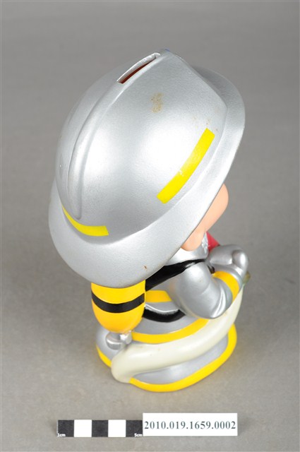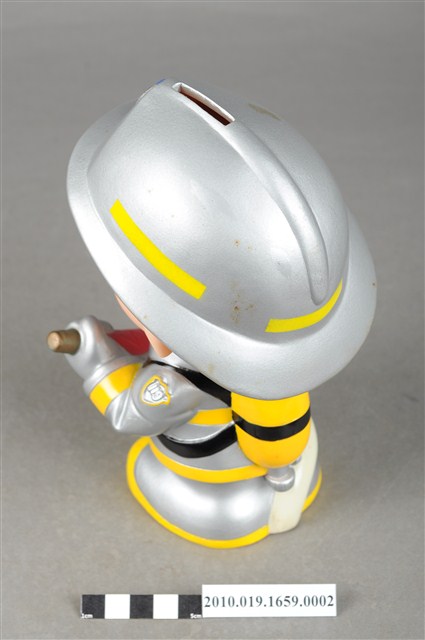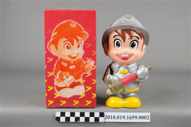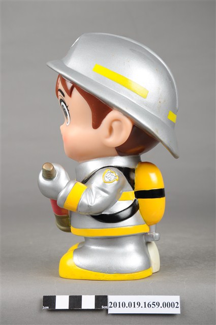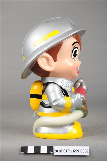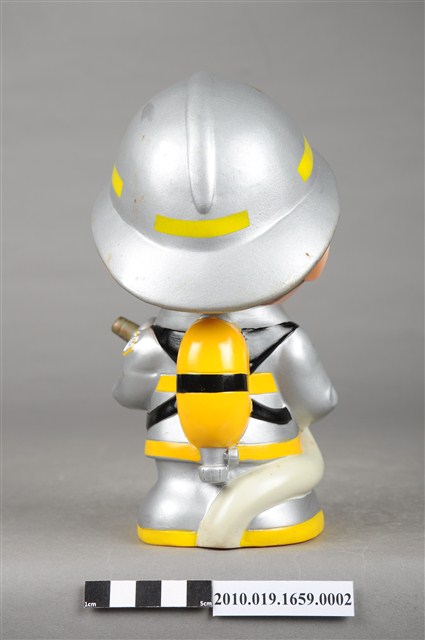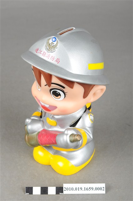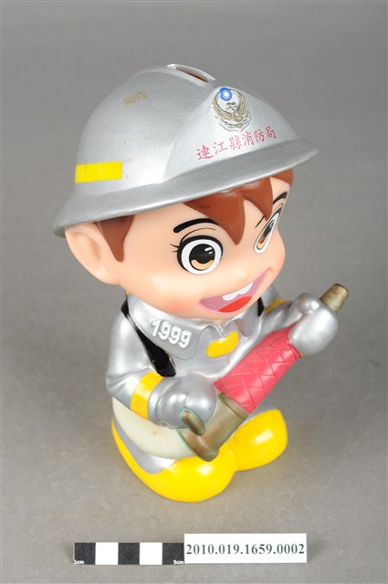 1.本物件為連江縣消防寶寶造型存錢筒,身穿銀色頭盔、消防衣與靴子的全套消防設備,手拿消防瞄。頭盔上有「連江縣消防局」字樣與消防標誌,右側衣領上有「1999」字樣的消防寶寶存錢筒。