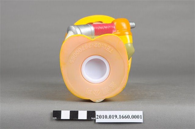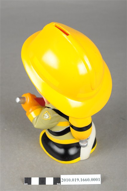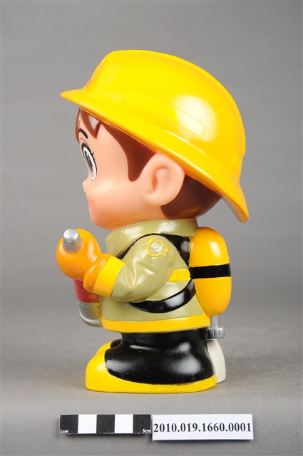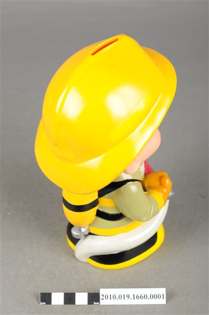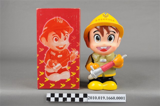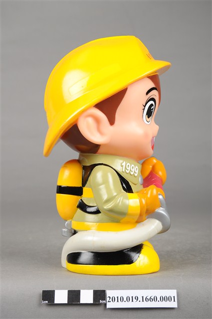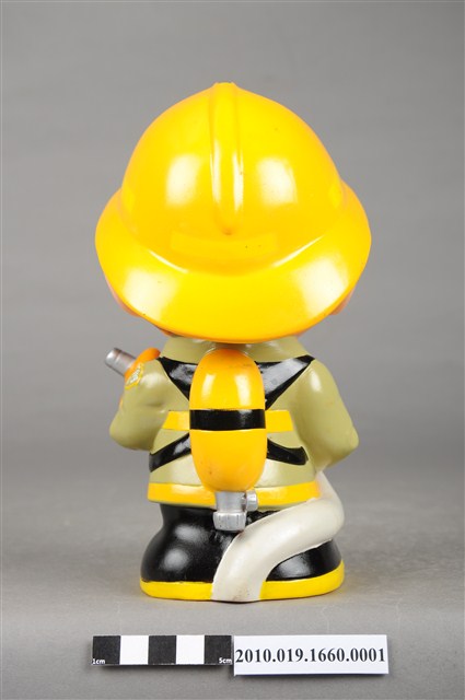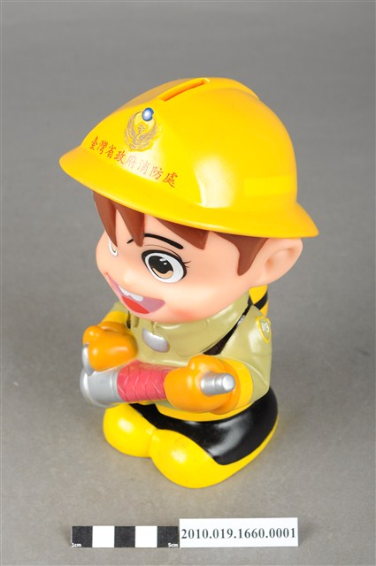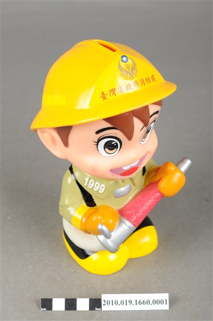 1.本物件為台灣省政府消防寶寶造型存錢筒,身穿黃色頭盔、綠色消防衣、黑色靴子的全套消防設備,手拿消防瞄,頭盔上有「台灣省政府」字樣與消防標誌,右側衣領上有「1999」字樣的消防寶寶存錢筒。