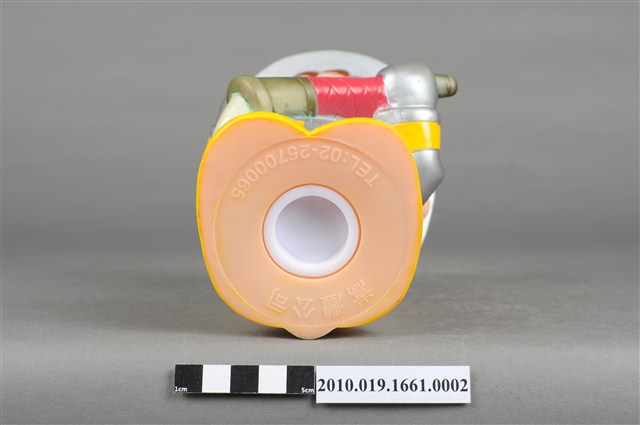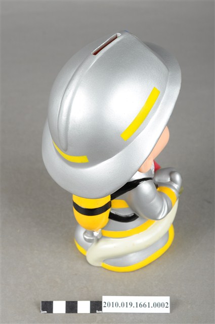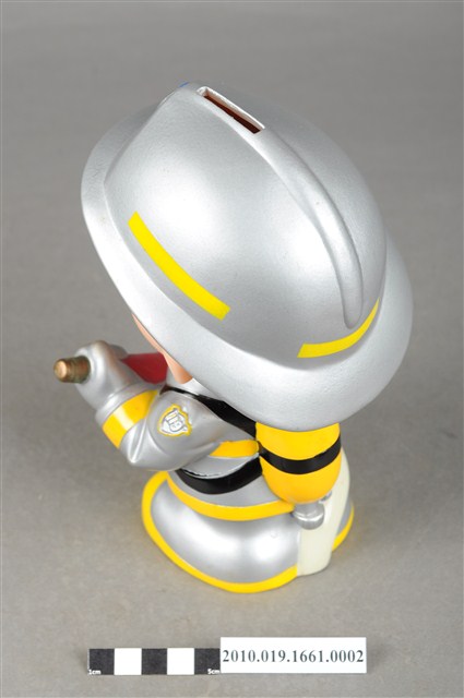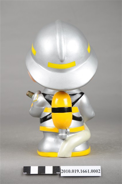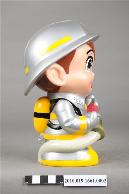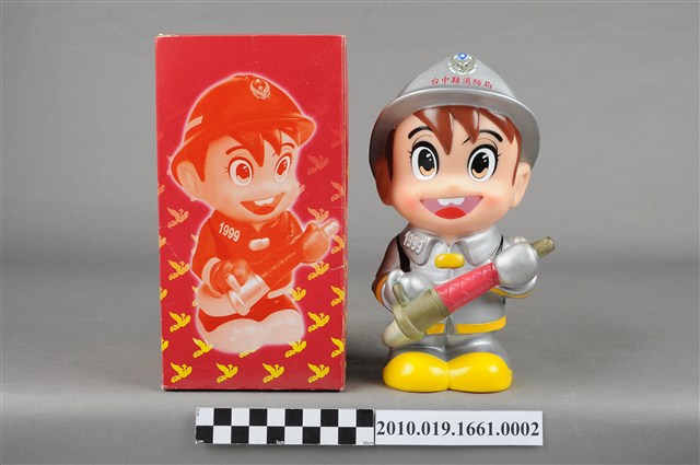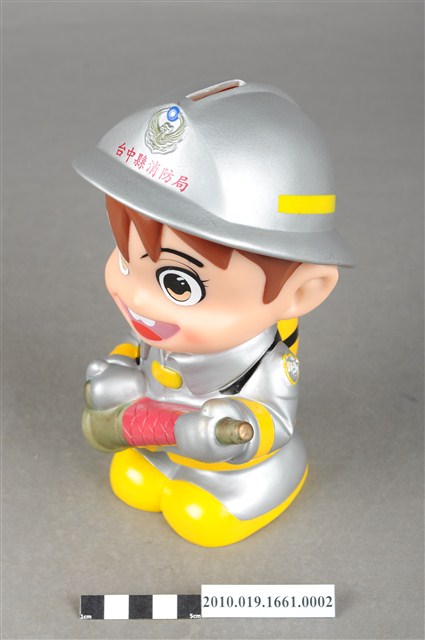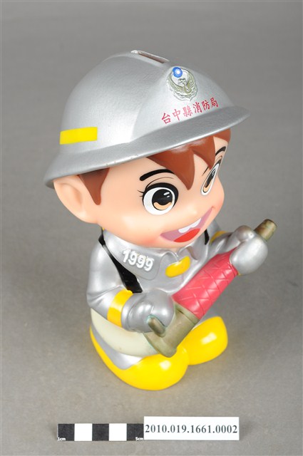 1.本物件為臺中縣消防寶寶造型存錢筒,身穿銀色頭盔、消防衣與靴子的全套消防設備,手拿消防瞄。頭盔上有「台中縣消防局」字樣與消防標誌,右側衣領上有「1999」字樣的消防寶寶存錢筒。