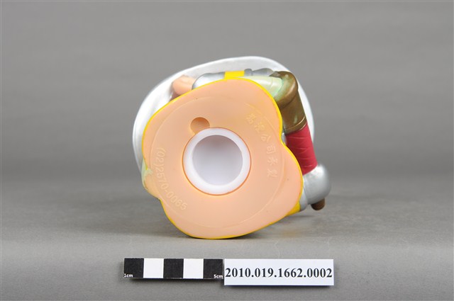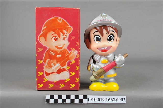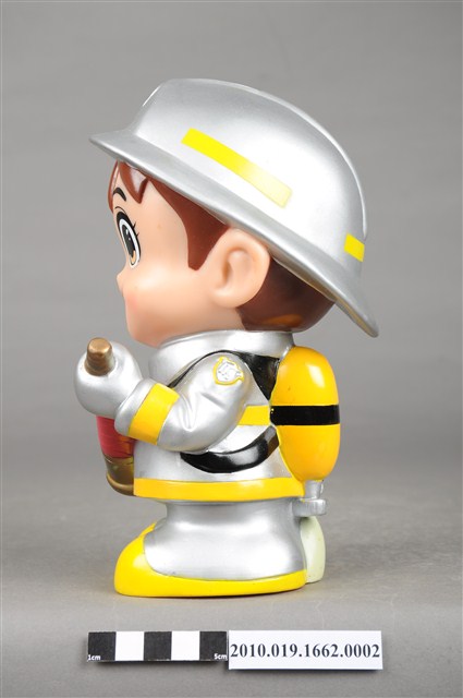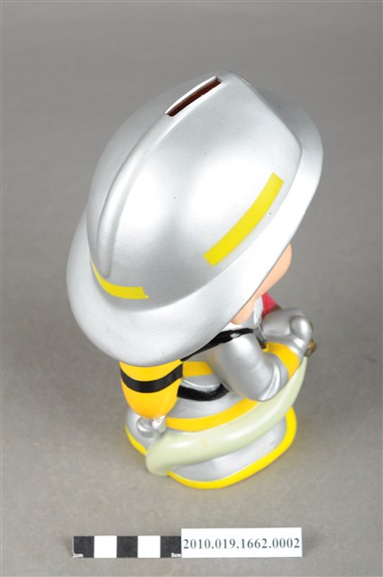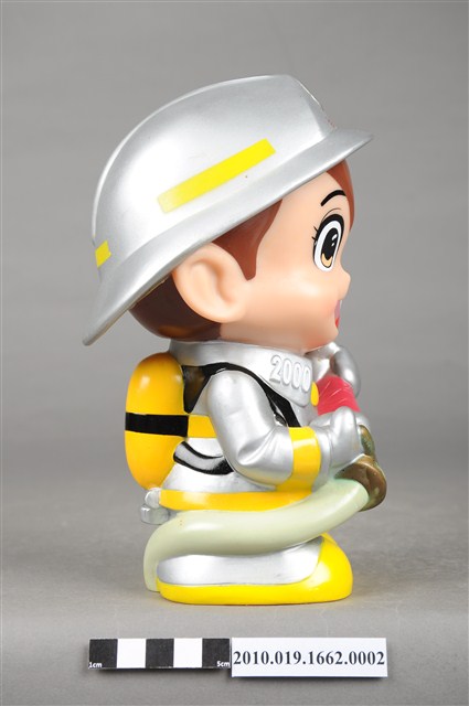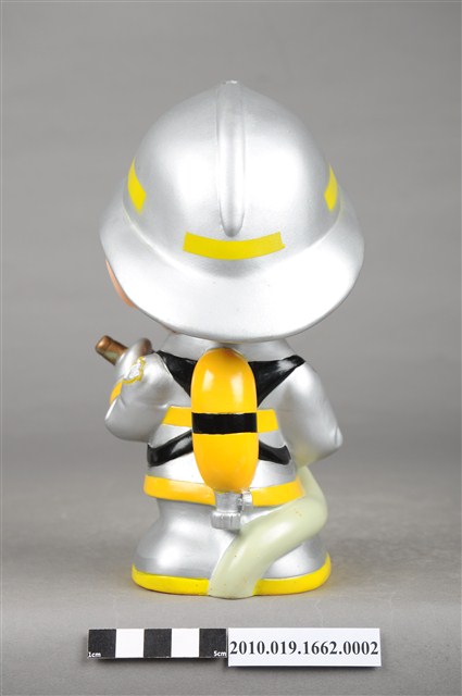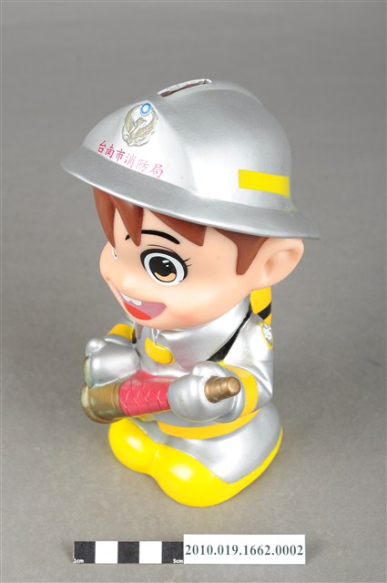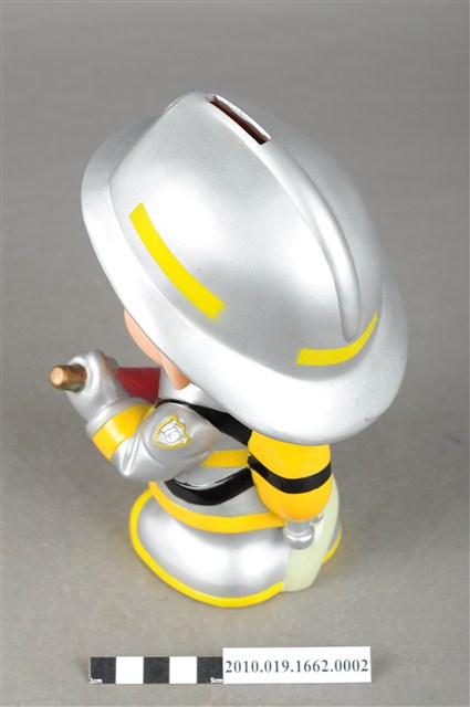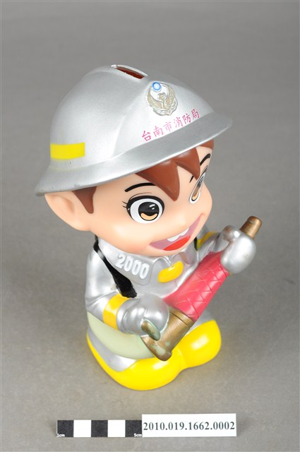 1.本物件為臺南市消防寶寶造型存錢筒,身穿銀色頭盔與消防衣、銀黃色靴子的全套消防設備,手拿消防瞄。頭盔上有「台南市消防局」字樣與消防標誌,右側衣領上有「2000」字樣的消防寶寶存錢筒。