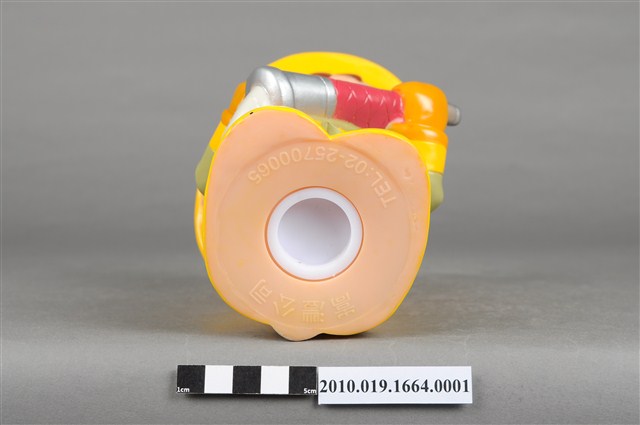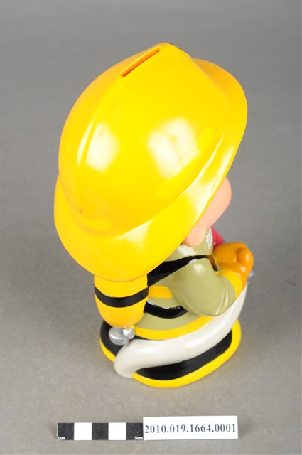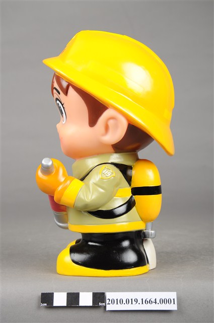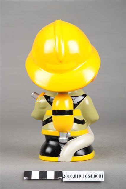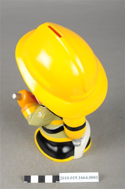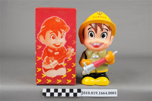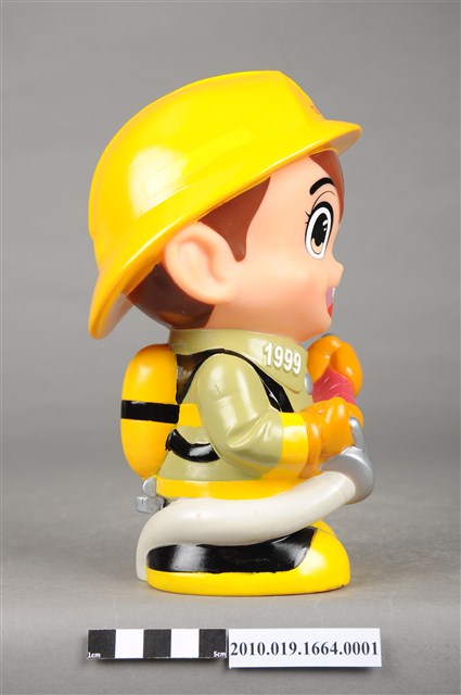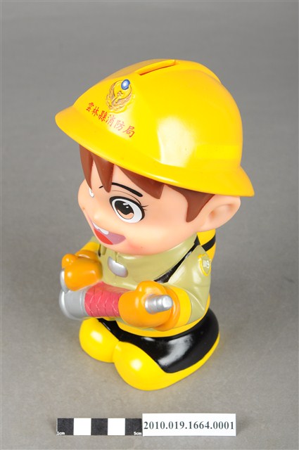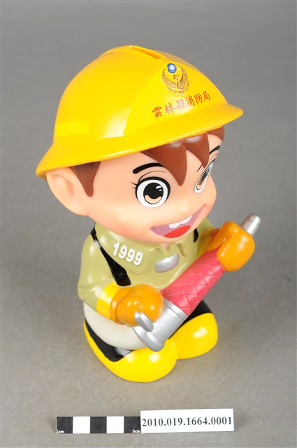 1.本物件為雲林縣消防寶寶造型存錢筒,身穿黃色頭盔、綠色消防衣、黑色靴子的全套消防設備,手拿消防瞄,頭盔上有「雲林縣消防局」字樣與消防標誌,右側衣領上有「1999」字樣的消防寶寶存錢筒。