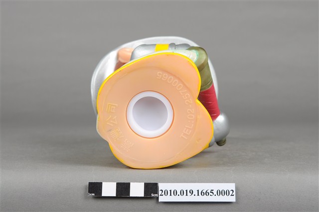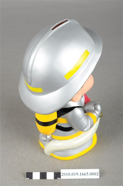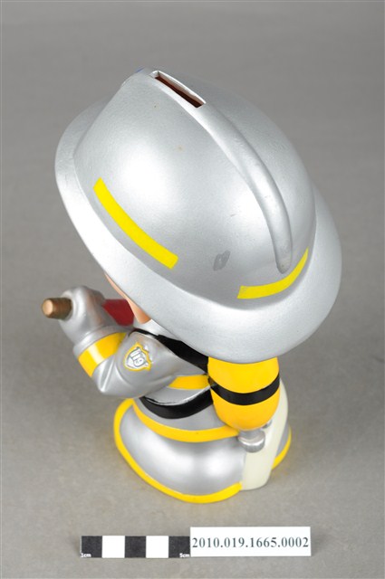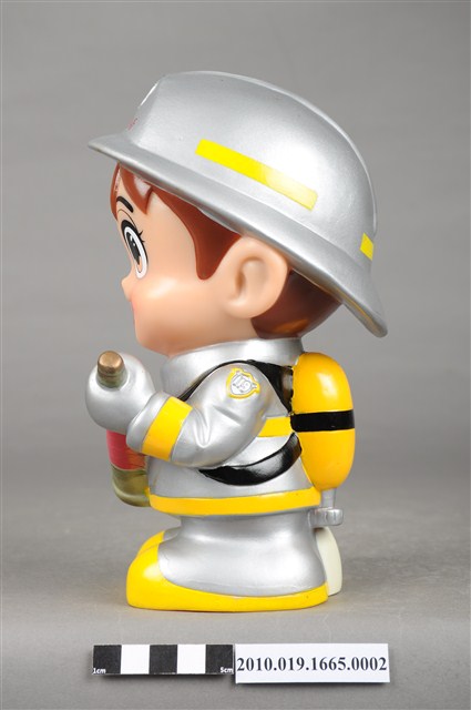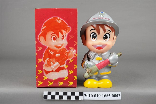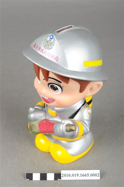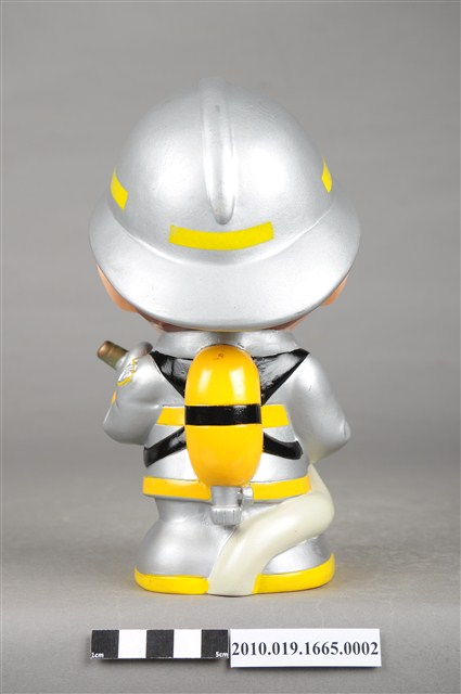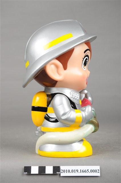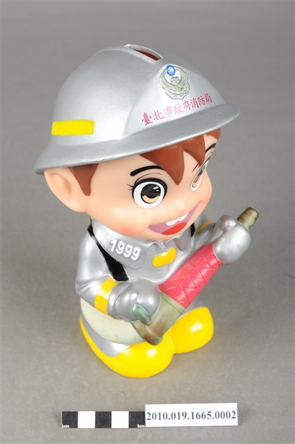 1.本物件為台北市消防寶寶造型存錢筒,身穿銀色頭盔、消防衣與靴子的全套消防設備,手拿消防瞄。頭盔上有「台北市消防局」字樣與消防標誌,右側衣領上有「1999」字樣的消防寶寶存錢筒。