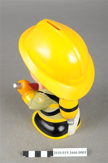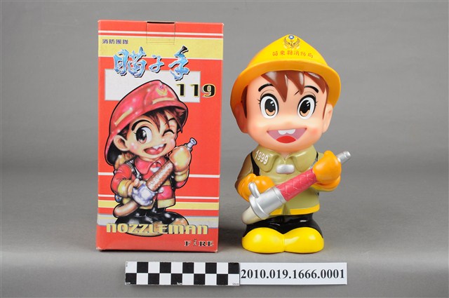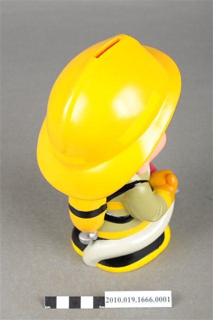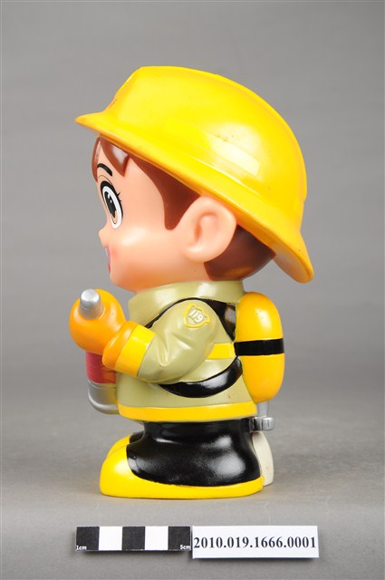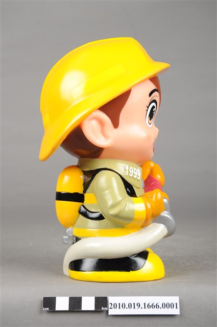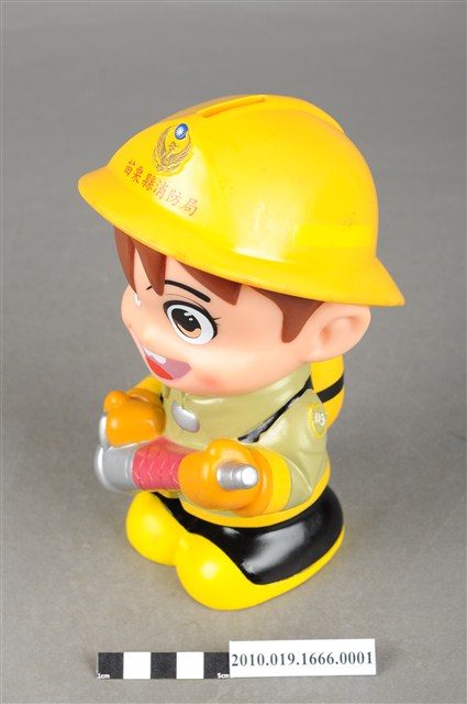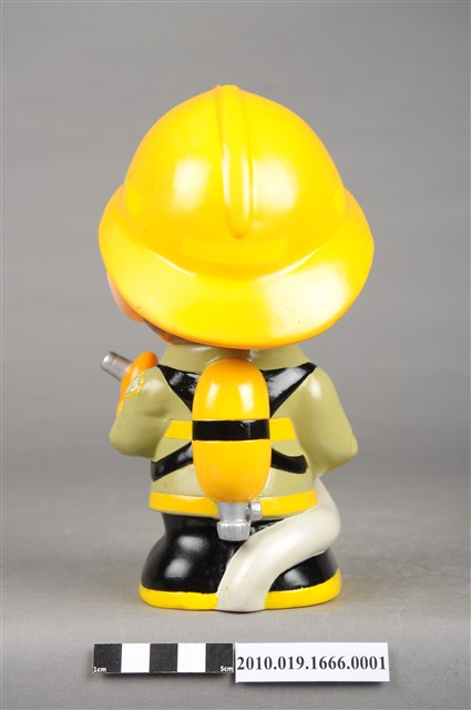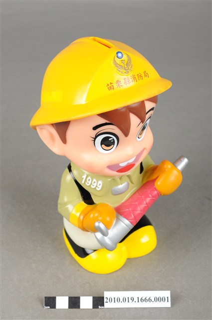 1.本物件為苗栗縣消防寶寶造型存錢筒身穿黃色頭盔、綠色消防衣、黑色靴子的全套消防設備,手拿消防瞄,頭盔上有「苗栗縣消防局」字樣與消防標誌,右側衣領上有「1999」字樣的消防寶寶存錢筒。