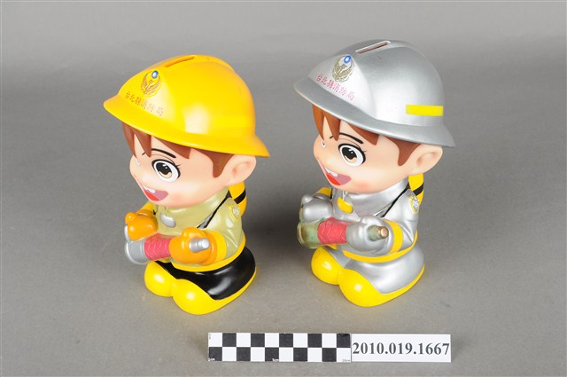 1.本物件為臺北縣消防寶寶造型存錢筒組,身穿全套消防設備,手拿消防瞄的消防寶寶存錢筒。左邊為黃色頭盔、綠色消防衣、黑色靴子,右邊為銀色頭盔、消防衣、與靴子。兩個頭盔上都有「台北縣消防局」字樣與消防標誌,右側衣領上都有「1999」字樣。
