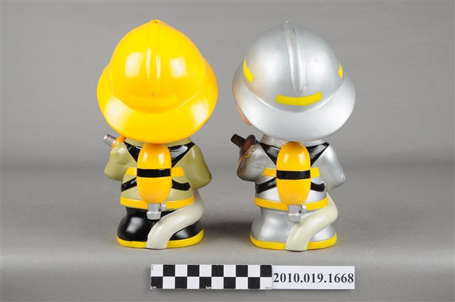 1.本物件為高雄縣消防寶寶造型存錢筒組,身穿全套消防設備,手拿消防瞄的消防寶寶存錢筒。左邊為黃色頭盔、綠色消防衣、黑色靴子,右邊為銀色頭盔、消防衣、與靴子。兩個頭盔上都有「高雄縣消防局」字樣與消防標誌,右側衣領上都有「1999」字樣。