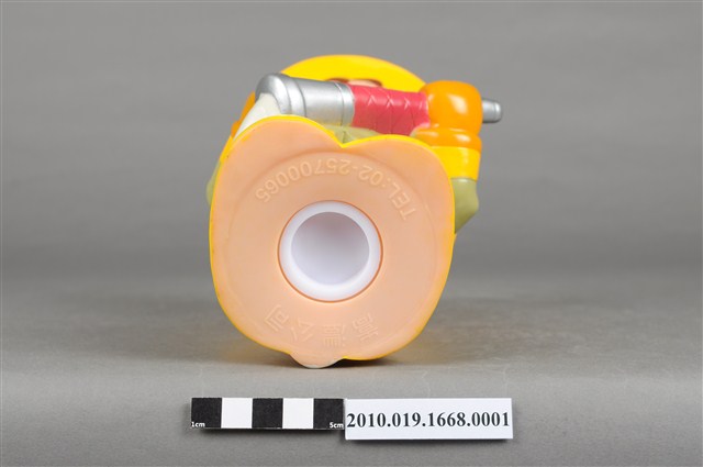 1.本物件為高雄縣消防寶寶造型存錢筒,身穿黃色頭盔、綠色消防衣、黑色靴子的全套消防設備,手拿消防瞄,頭盔上有「高雄縣消防局」字樣與消防標誌,右側衣領上有「1999」字樣的消防寶寶存錢筒。