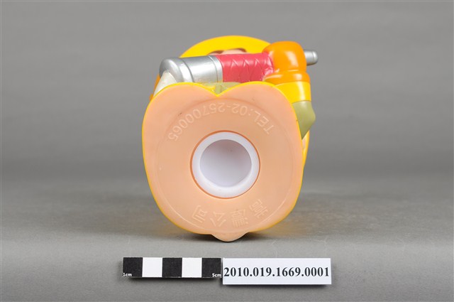1.本物件為臺南市消防寶寶造型存錢筒,身穿黃色頭盔、綠色消防衣、黑色靴子的全套消防設備,手拿消防瞄,頭盔上有「台南市消防局」字樣與消防標誌,右側衣領上有「1999」字樣的消防寶寶存錢筒。