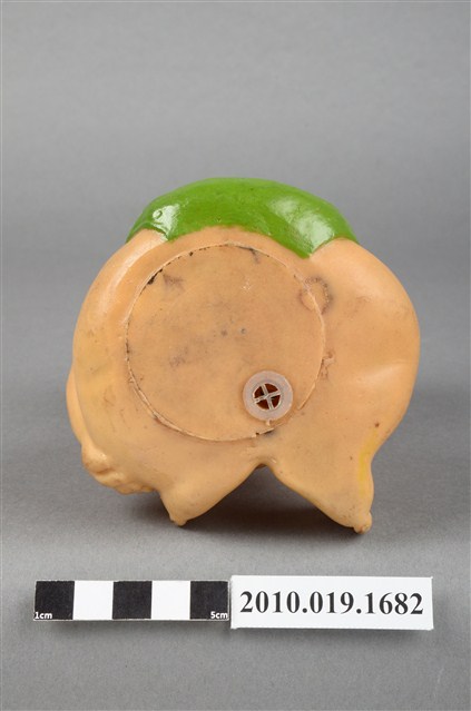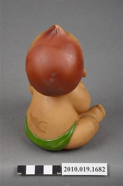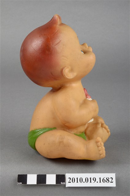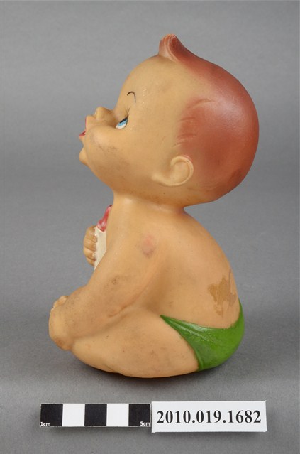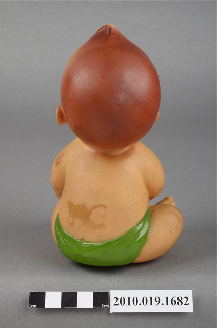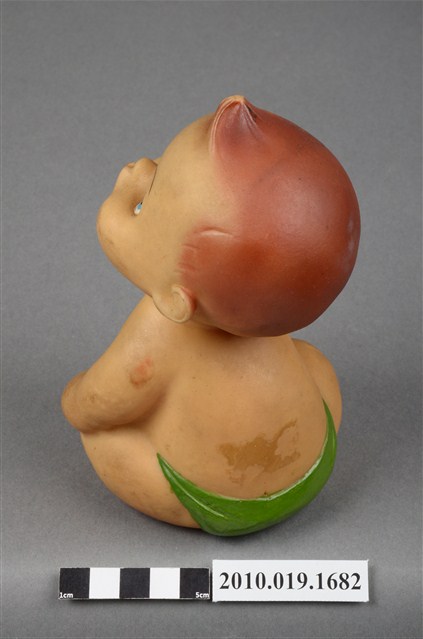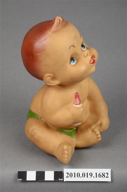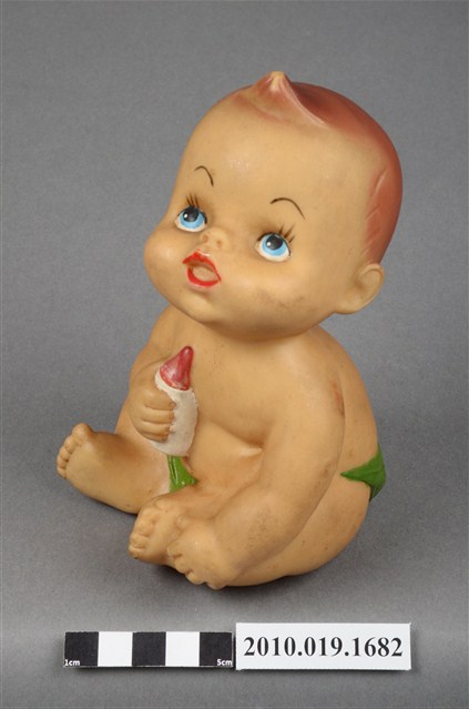 本物件為嬰兒造型玩偶,為塑膠材質一體成型,玩偶有瀏海,細眉藍眼看向上方,並張大嘴,未著上衣,下身僅著一條綠色圍巾,右手並持一個白色奶瓶,身體圓滾,以坐姿呈現,整個物件有明顯斑駁與污漬。