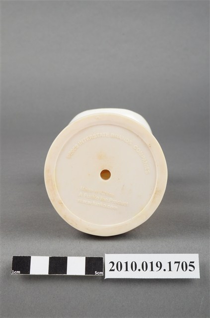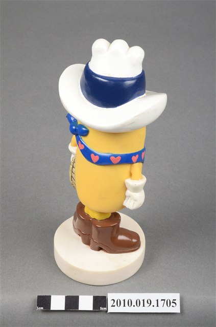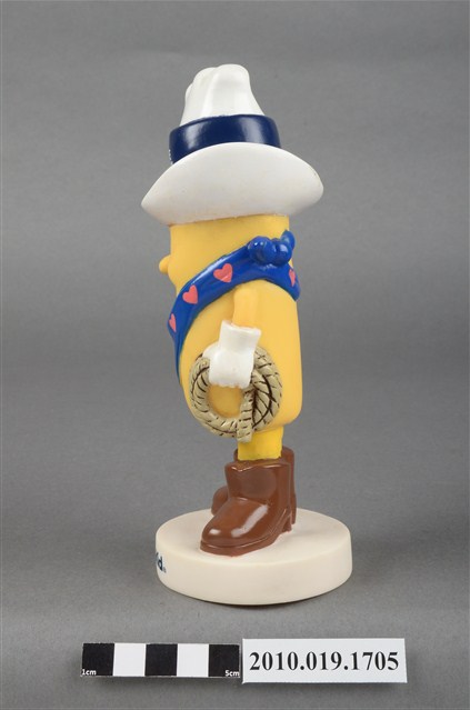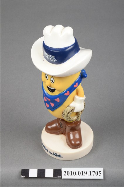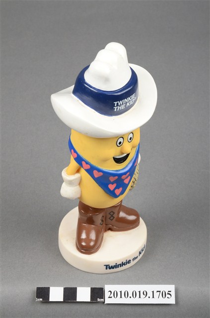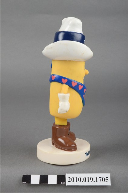 1.本物件為牛仔造型搖頭公仔,主體為黃色玉米狀,頭戴白色牛仔帽,上面並印有「Twinkie the Kid」字樣,細眉大眼,張嘴微笑並露出上排白色牙齒,胸口圍心形的方巾,手戴白色手套,右手插腰,左手則拿一捆繩子,腳著咖啡色靴子,站在白色底座上,底座前方寫有「Twinkie the Kid」字樣,底座下方寫有製造商及「Made In China」,玩偶頭部與身體由彈簧連接,因此能搖擺晃頭,整個物件保存良好。