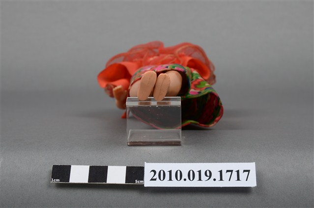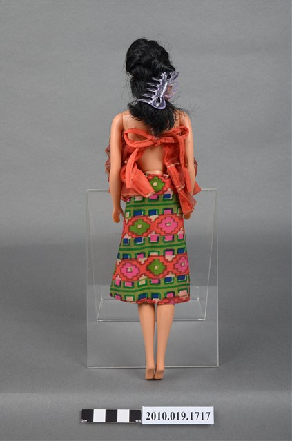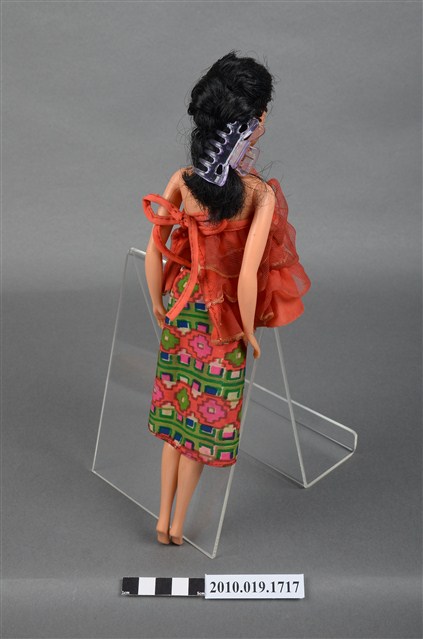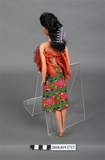 1.本物件為洋裝芭比娃娃玩偶,為塑膠材質,玩偶黑色捲長髮,後面並用透明鯊魚夾將頭髮夾起,細眉大眼,面帶微笑,身著紅色紗狀平口層次上衣,下身著綠底花裙子,腳上未著鞋,雙手與雙腳為活動式,可以擺出不同姿勢,整個物件保存良好。