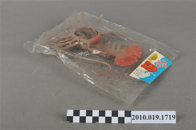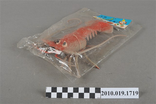 本物件為龍蝦造型玩具,塑膠材質一體成型,其外觀為紅色龍蝦,大眼睛,並有大螯及大龍鬚,整個物件造型逼真,保存尚可,外面以透明塑膠袋套上保存,紙卡上畫有劍、汽車、玩偶等圖案,標有「大同玩具」。