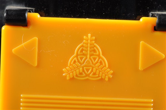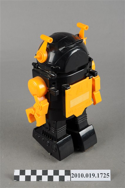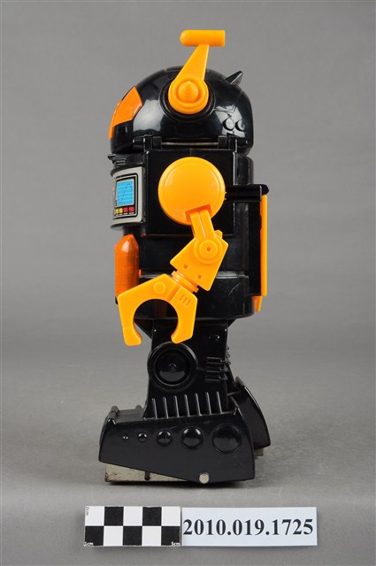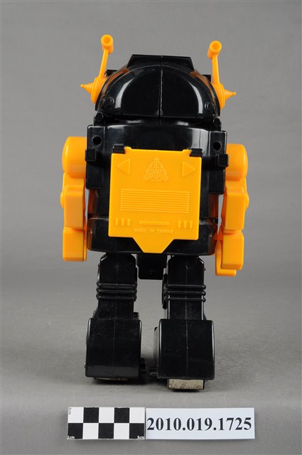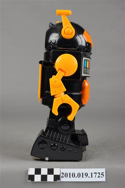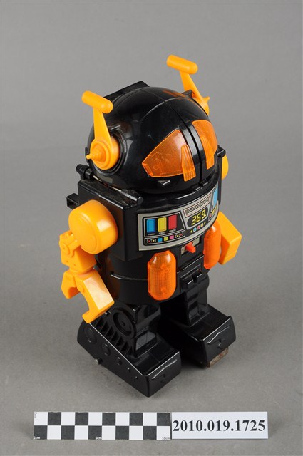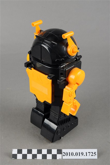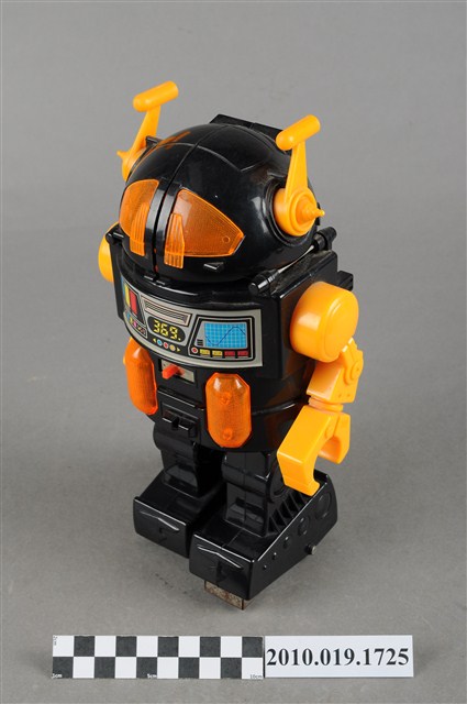 本物件為黑色機器人玩具,為塑膠材質,主體以黑色系為主,飛碟造型頭上有兩根橘色的感應器,眼罩處為橘色塑膠片,胸口處有面板,上面標示「36.9」的數字,下方還有兩個橘色燈罩,雙手為橘色C字型,雙腳下方各有兩顆輪子,讓機器人可以移動行走,背後有一個橘色塑膠板,上面印有製造商商標,整個物件保存良好。