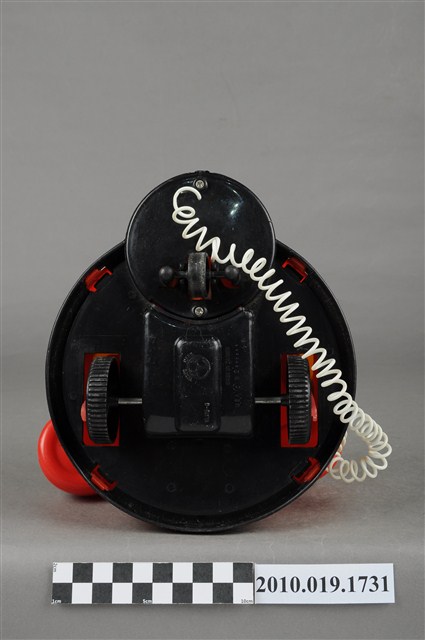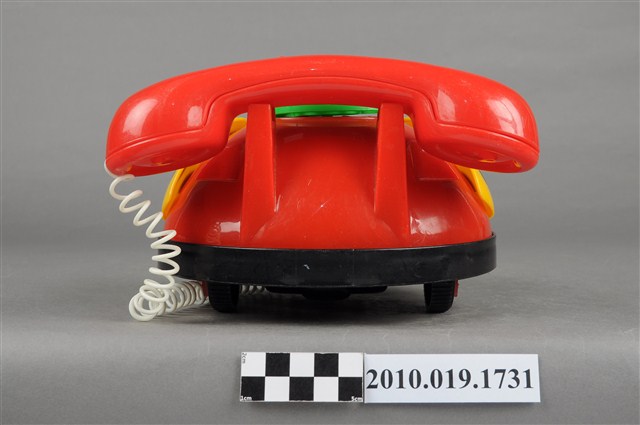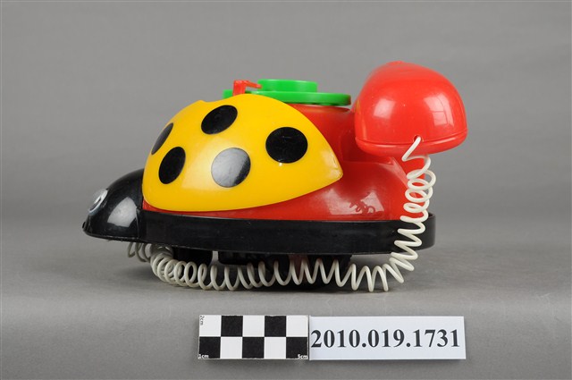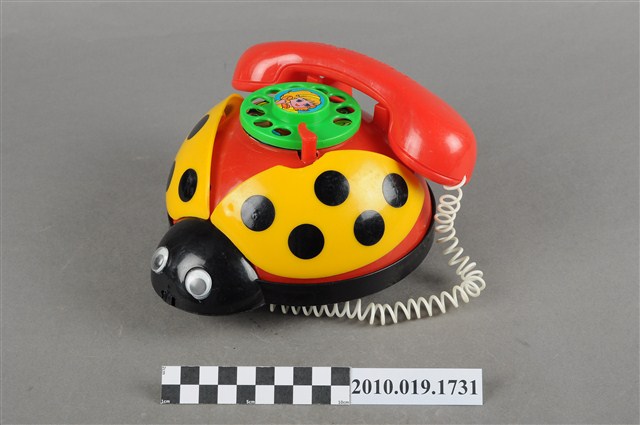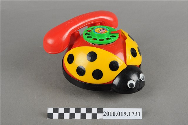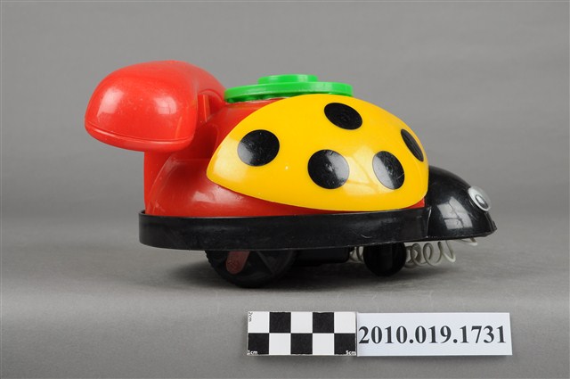 本物件為瓢蟲造型轉盤電話玩具,塑膠材質,瓢蟲為紅色,背上有黃底黑色圓點的翅膀,頭部為黑色,背部有綠色撥號盤,中間印有一張貼紙,上面圖案為一個女孩講電話,底座有三顆輪子,方便移動,底座印有其商標與「MADE IN TAIWAN」字樣,整個物件保存良好,顏色鮮明。