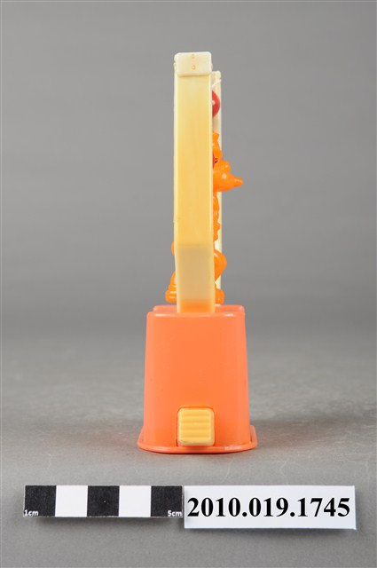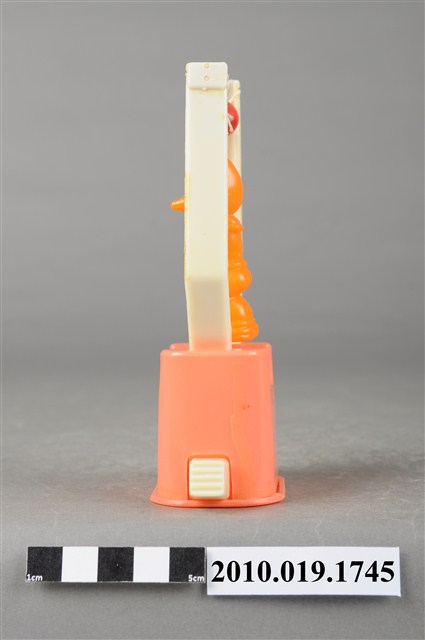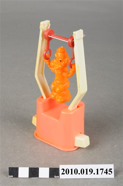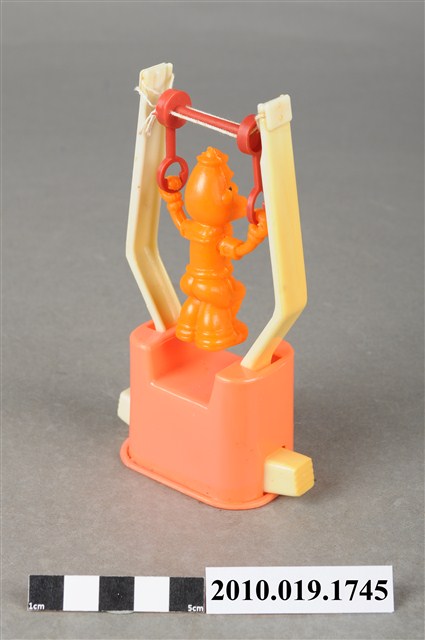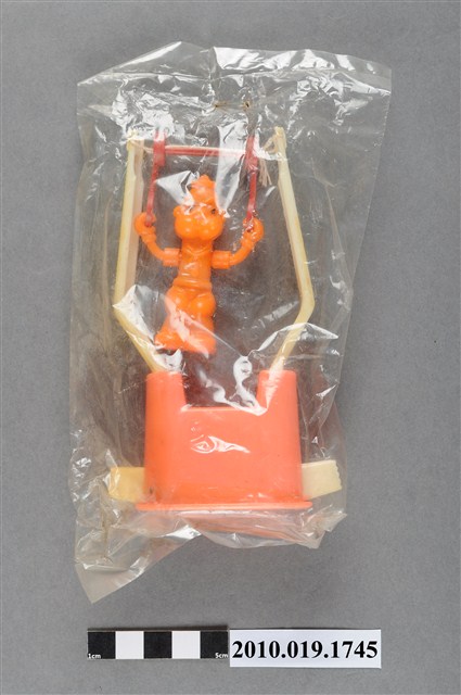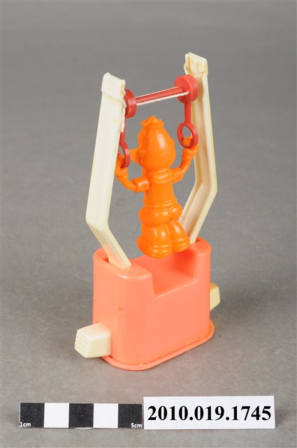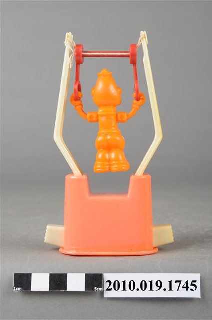 1.本物件為大力水手卜派造型玩具,橘色塑膠玩偶拉單槓,單槓底座為粉紅色,兩旁為泛白支柱,主角是大力水手卜派,張開雙手拉著紅色吊臂雙腳微彎懸空,玩偶五官沒有非常明顯,最後以透明塑膠袋套上。