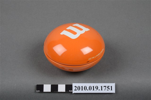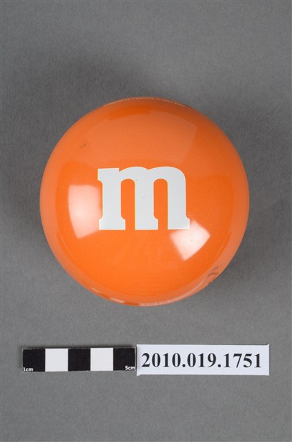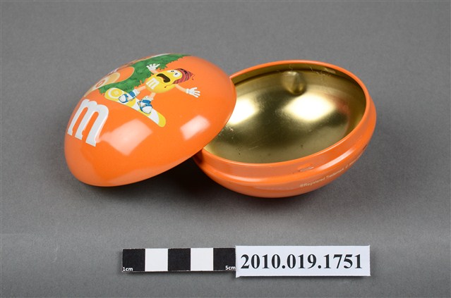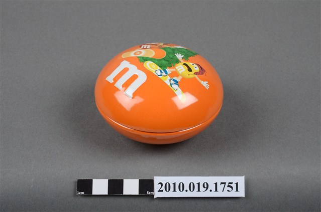 1.本物件為M&M's橘色鐵製糖果盒,橘色圓形鐵盒,蓋子圖案有2隻M&M's娃娃,1隻是黃色頭戴紅色毛帽,另1隻是橘色,2隻都腳踩滑板,最下面還有白色字體寫下「M」。