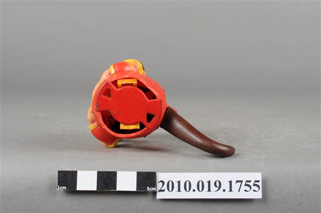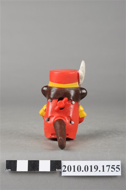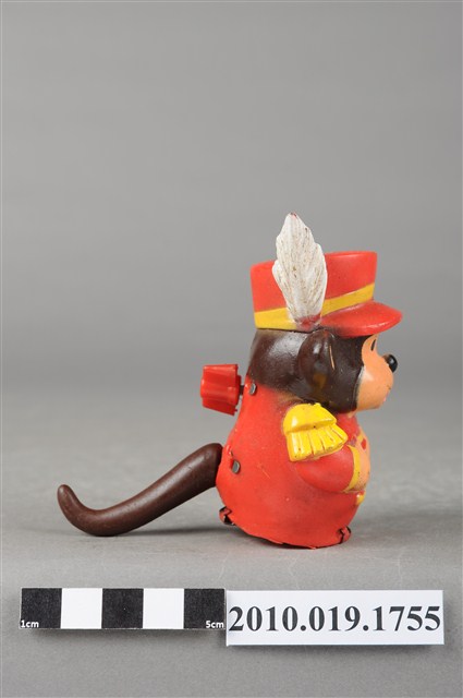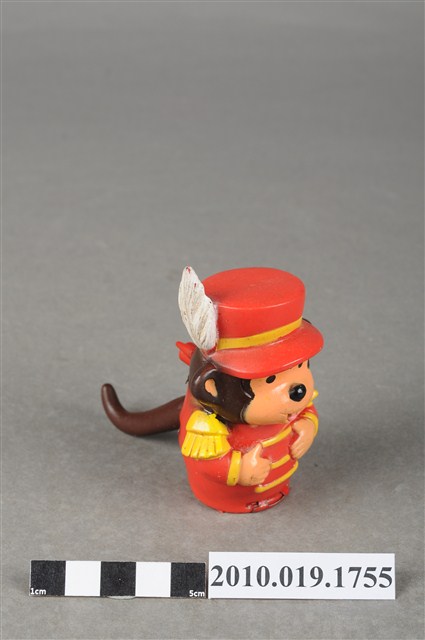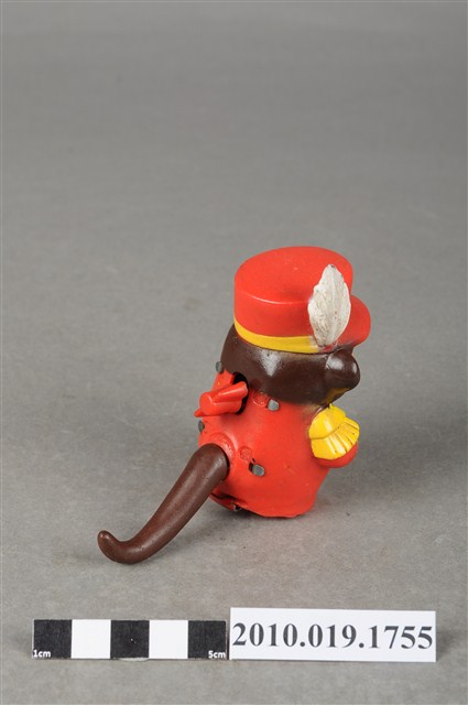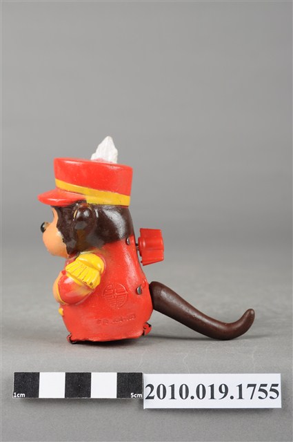 本物件為塑膠製猴子造型玩偶,發條式玩偶,猴子頭戴紅色帽子滾黃邊,帽子右邊有根白色羽毛,身著紅色衣服滾黃色線條,表情微笑,兩手放於胸前,背後有條咖啡色尾巴,玩偶旁邊有個用以裝置的盒子,上面寫「RUN OF MONKEY」、「妙妙猴」字樣。