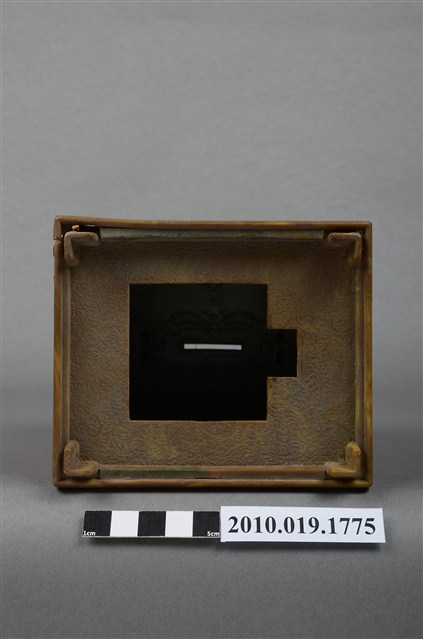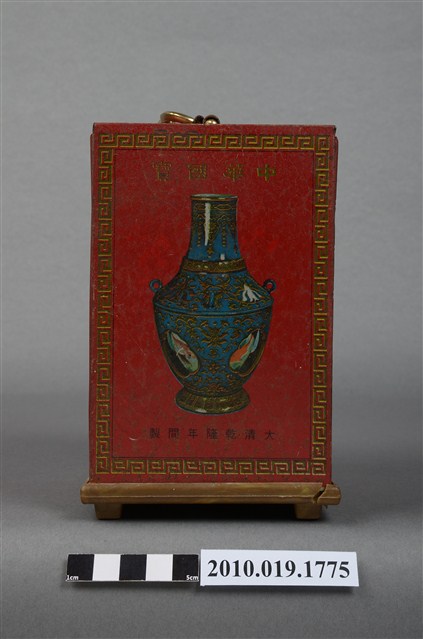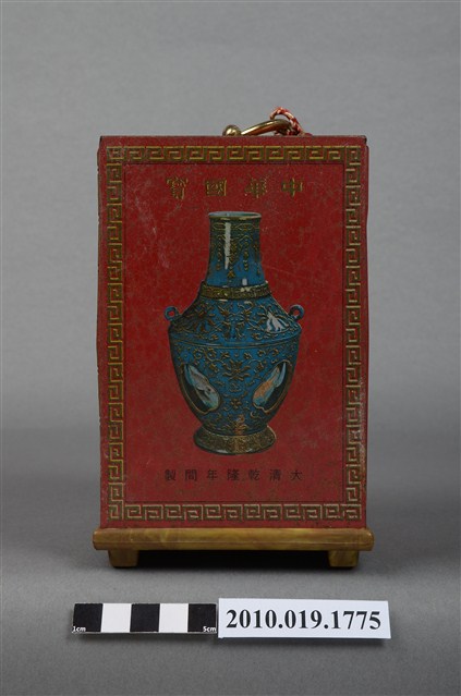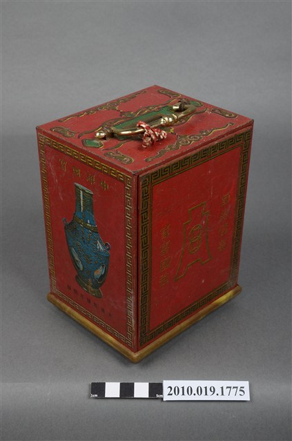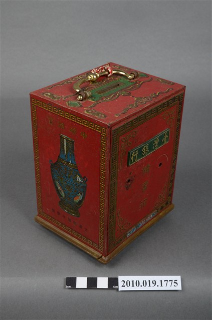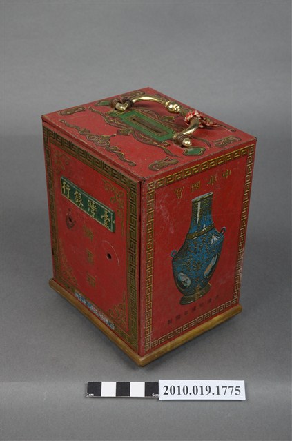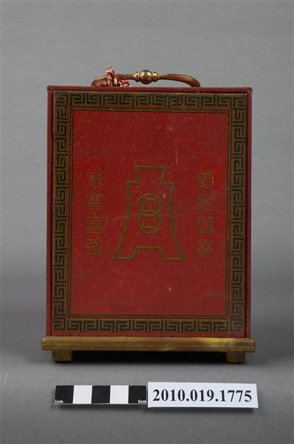 本物件為儲蓄箱,材質為金屬製,整體為大紅色的立體四邊形造型,前後左右四面皆有萬字紋邊框。正面印有「儲蓄箱」字樣其兩旁各有一孔洞,可由孔洞旁刻劃的等距半徑圓弧猜測應原有裝飾物件,上方鑲有一塊寫著「臺灣銀行」字樣名牌,背面正中央印有一個布錢符號及「節約儲蓄」、「家富國強」字樣,左右兩面皆印有彩色「清乾隆霽青描金游魚轉心瓶」圖案及「中華國寶」、「大清乾隆年間製」字樣,在頂部正中央有一長方形孔洞可投零錢,並裝有一個金屬色塑膠提把,提把繫著一條紅白色尼龍繩,底部中心有一「凸」字型孔洞,應為取出零錢處。