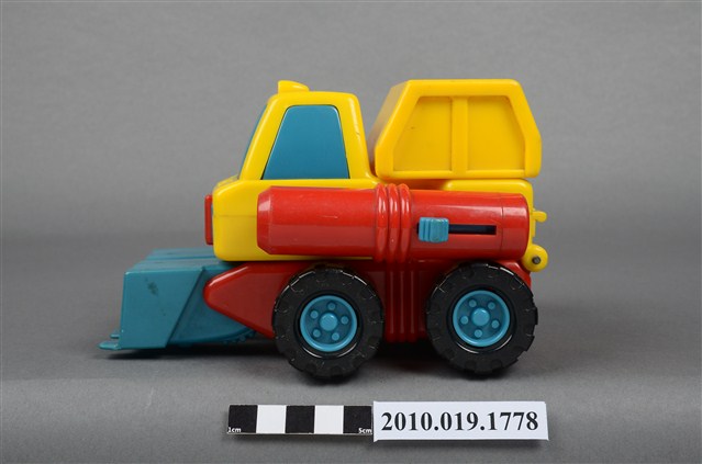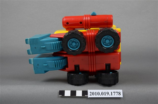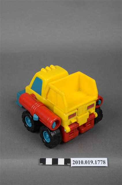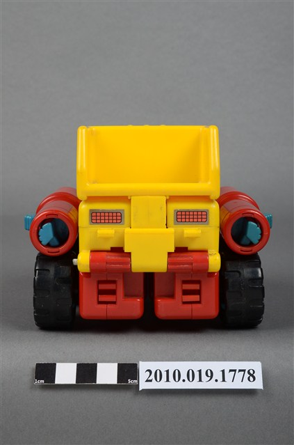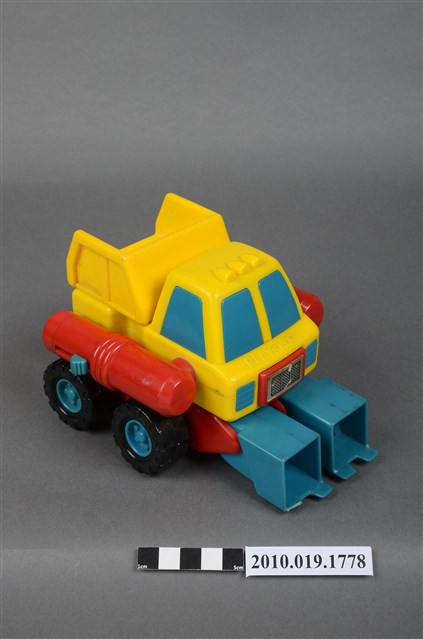 1.本物件為變形金鋼玩具車,材質為塑膠,呈現為傾卸卡車造型,也可變為機器人造型。傾卸卡車造型:黃色車體連著載土車斗,車頭印有「PLAYSKOOL」字樣,前面有藍色鏟土的推土刀。機器人造型:將黃色車體上掀,再將藍色推土刀往後轉變成腳即可站立,原置於輪胎上方的紅色圓筒,則成為機器人的手,機器人胸前貼著「first transformers」貼紙。