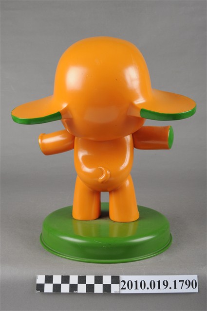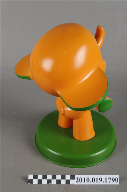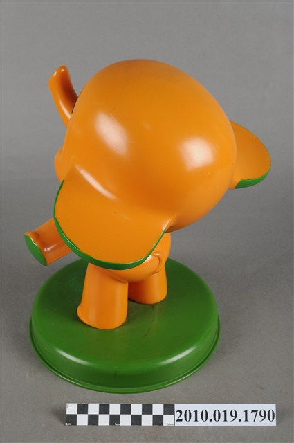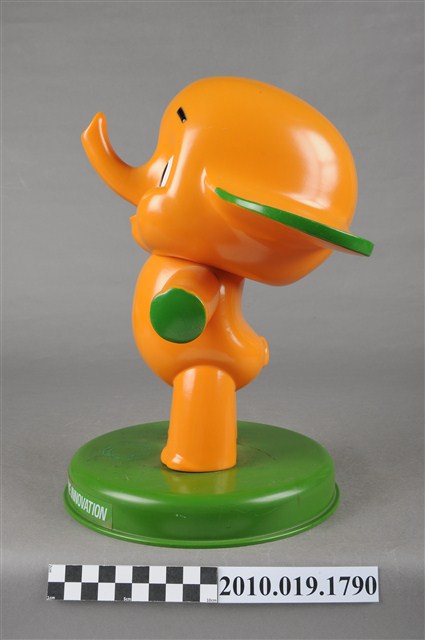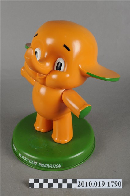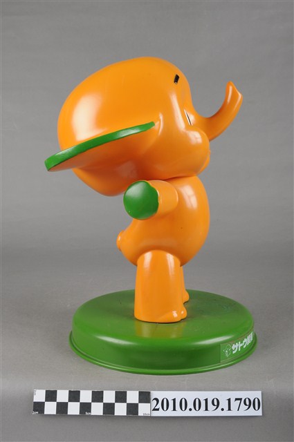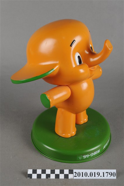 1.本物件為佐藤製藥佐藤象企業玩偶,材質為塑膠,呈現站姿。橘色小象揚著鼻子,帶著開心的笑容,耳朵往兩旁張開,兩個粗短的前肢也往兩旁張開,小象的腳底連著一個綠色底座,前方貼著「サトウ製薬 HEALTH CARE INNOVATION」字樣的貼紙,底座的內部有裂痕及兩個螺絲可固定小象。