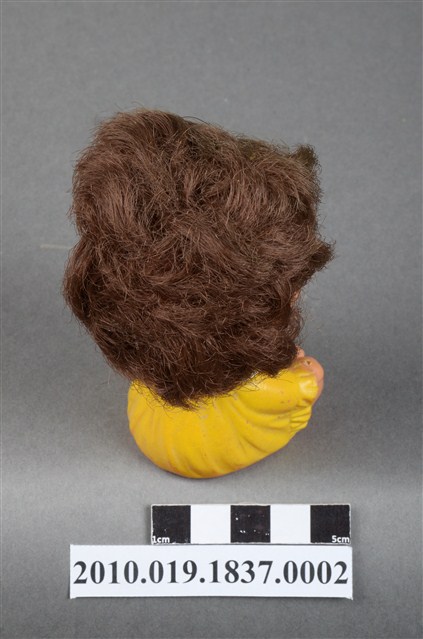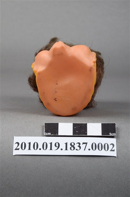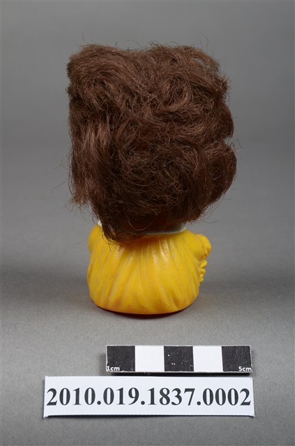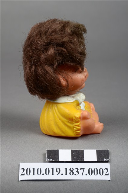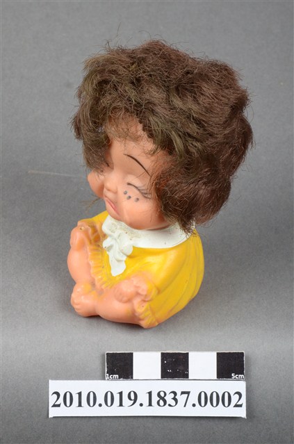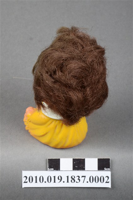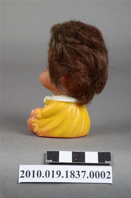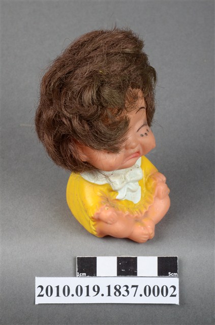 本物件為喜怒哀樂表情玩偶,高約8公分,寬約5公分,材質為軟膠。玩偶瞇著眼睛撇嘴哭泣,兩眼下方均有三個黑點,兩側臉頰各有一淚形突起代表眼淚,姿勢為盤坐,雙手置於膝上,穿著白色領口有蝴蝶結的黃色小洋裝,背部可見衣服的皺摺,頭髮茂密,底部有「TAIWAN」字樣、些微污損。整體有多處磨損污漬。