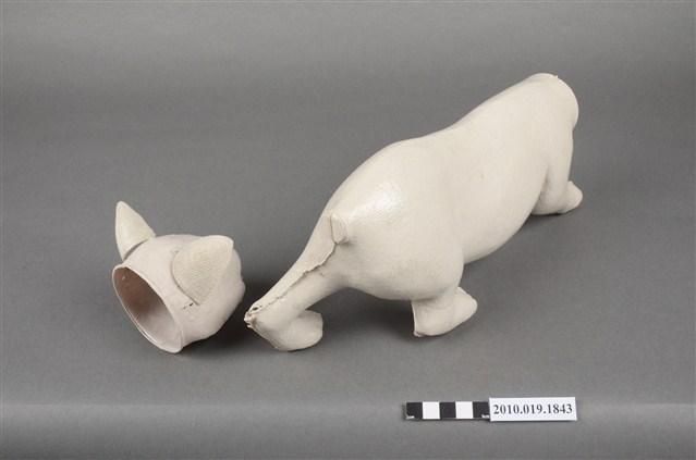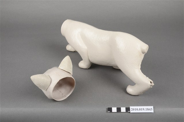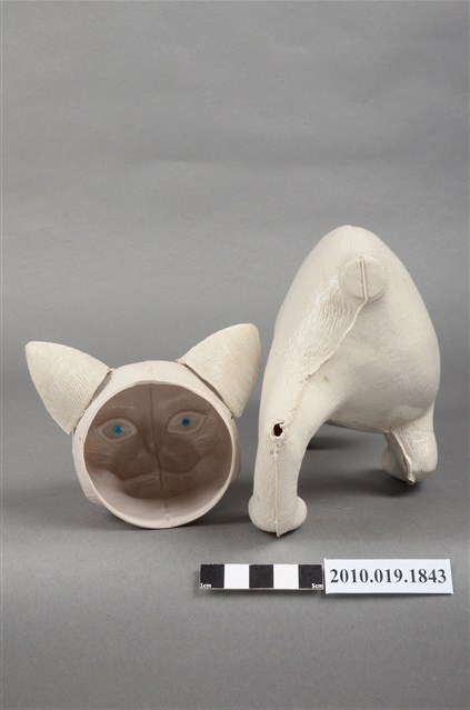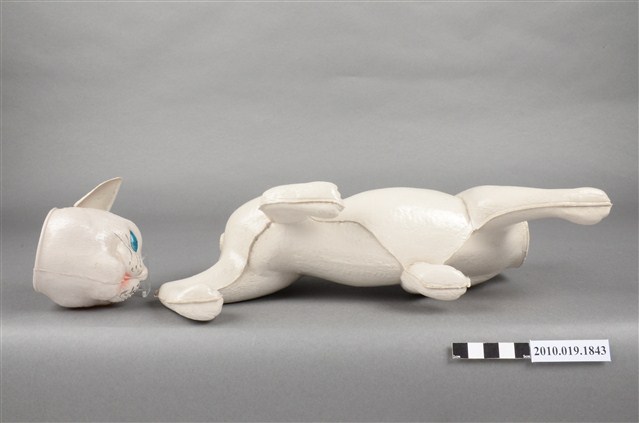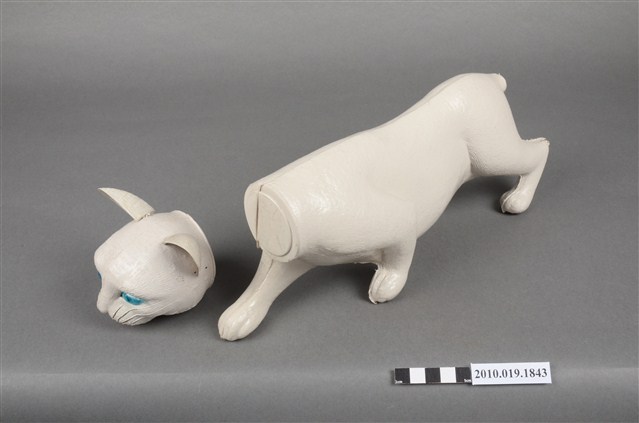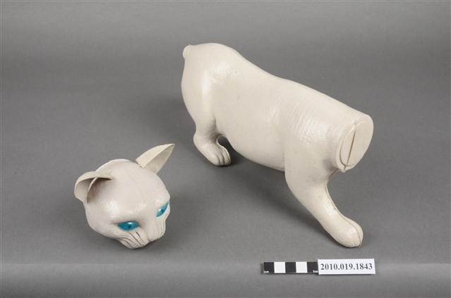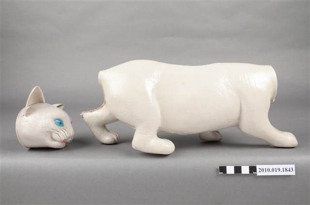本物件為貓玩偶,材質為塑膠,整體呈現為貓行進的模樣,但貓頭脫落且沒有尾巴。貓玩偶是隻白貓,有一對藍眼睛、伏貼的鬍鬚、豎立的尖耳朵,以同手同腳姿勢行進。