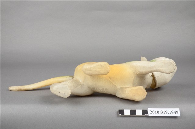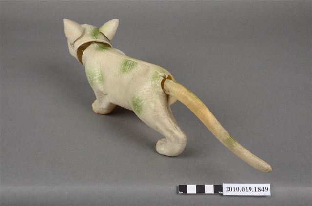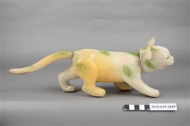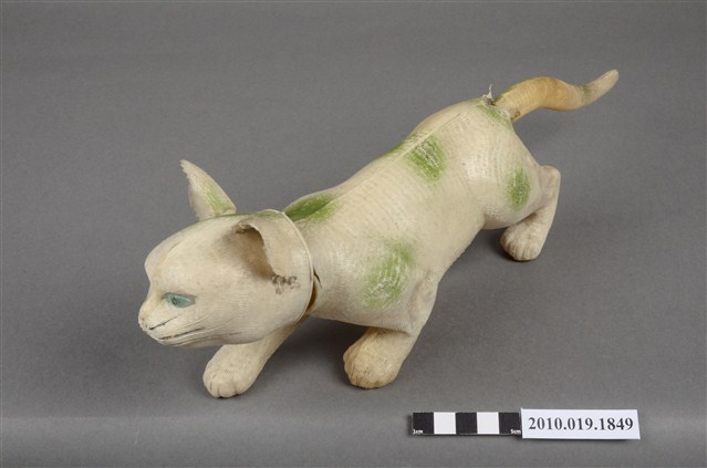 本物件為搖頭貓玩偶,材質為塑膠,整體呈現為貓行進的模樣。搖頭貓玩偶是隻有少許綠色斑點的白貓,有一對綠色眼睛、伏貼的鬍鬚、豎立的尖耳朵,搖頭貓玩偶製作時從頭到尾都有將細毛表現出來,且以同手同腳姿勢行進,貓肚子印有「MADE IN HONG KONG」,另外,貓頭及貓尾都設有活動關節與身體連接,所以放置時會晃動。