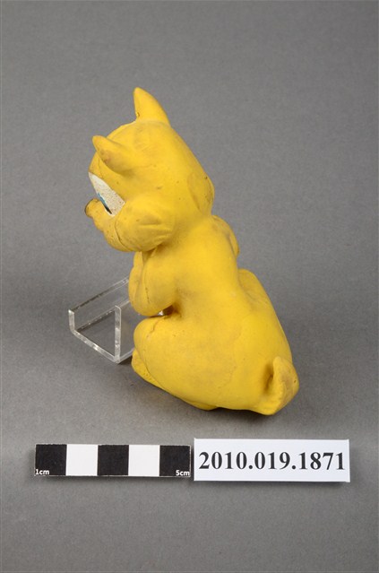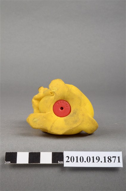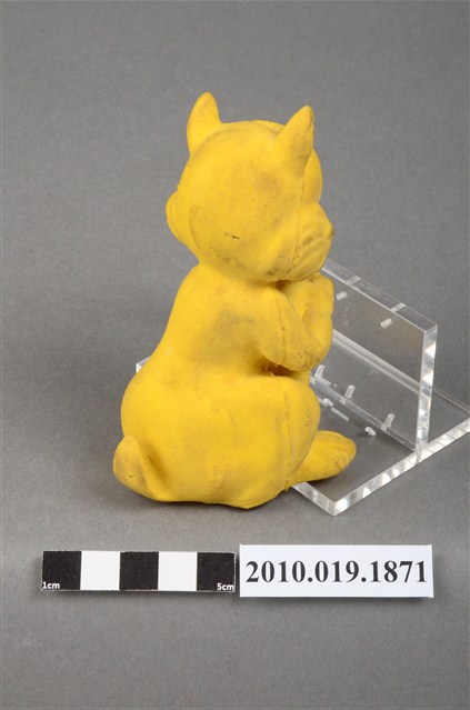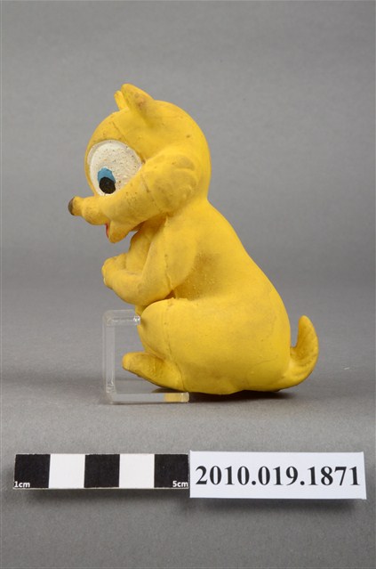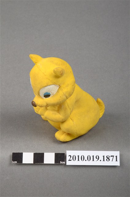 本物件為松鼠玩偶,材質為塑膠,呈現立姿。松鼠全身為黃色,頭上有一對小巧豎立的尖耳,臉部有雙又圓又大的眼睛、俏挺的鼻子、張著嘴巴一臉驚喜的樣子,雙手置於胸前,雙腳與屁股著地,屁股翹著短小的尾巴,底部有個中空的紅色圓形塞子印有「TAIWAN」字樣。
