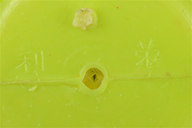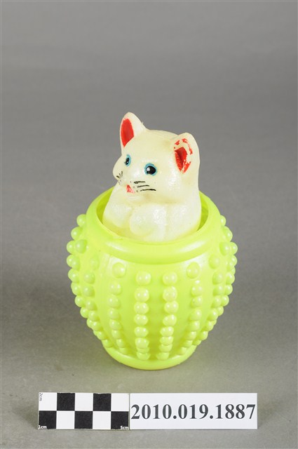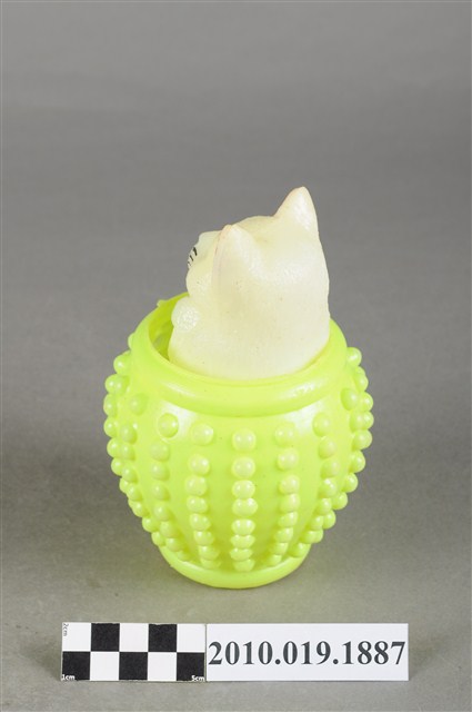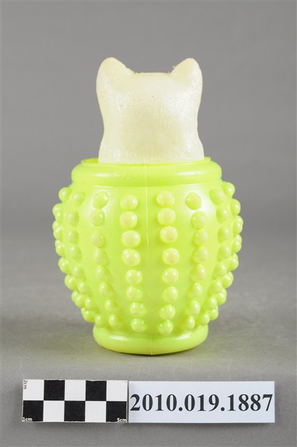 本物件為黃色水缸貓玩具,材質為塑膠,整體呈現為貓咪在水缸裡的造型。貓咪是隻白貓,有雙藍眼睛、張著嘴巴,豎起耳朵,在黃色水缸中探出頭,水缸底部有「利荣」字樣及發聲器。