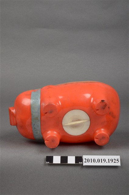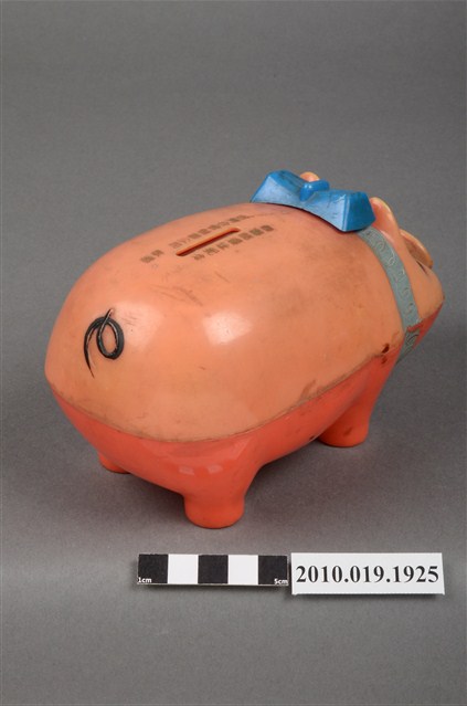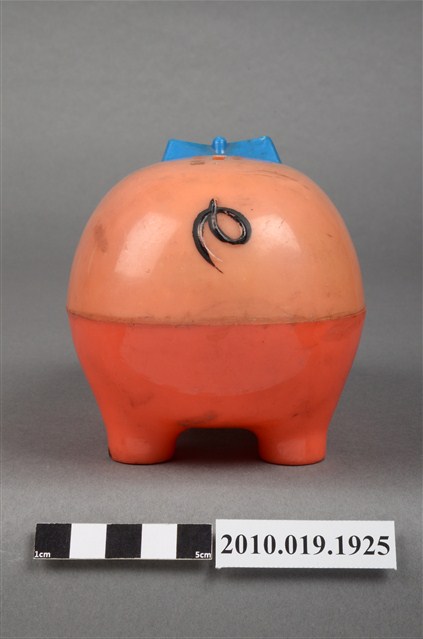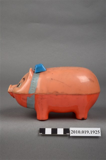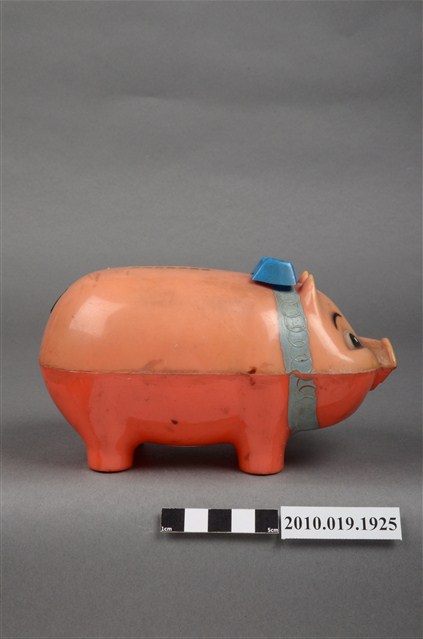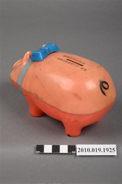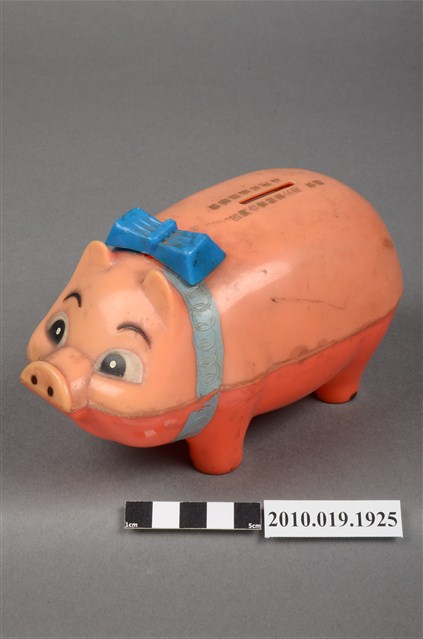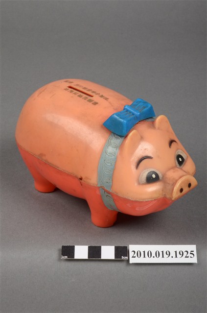 1.本物件為臺灣合會儲蓄公司豬造型存錢筒,塑膠製,上半部皮膚色、下半部粉紅色,脖子圍有藍色蝴蝶結,有黑色眼睛與眉毛,後方有黑色尾巴,背部有「臺灣合會儲蓄公司儲蓄部敬贈」、「儲蓄部遷址紀念」等字樣。