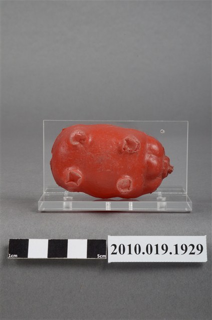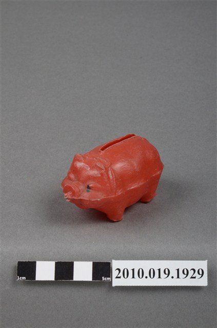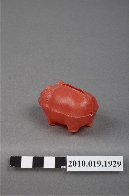 1.本物件為紅色豬造型存錢筒,塑膠製,臉部塗有眼睛塗料的部分已經脫落,背上投幣孔做工較為粗糙,四肢的腳底有向內凹陷的狀況。