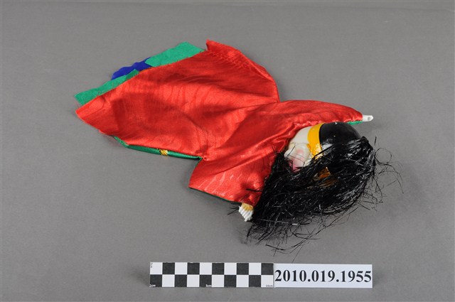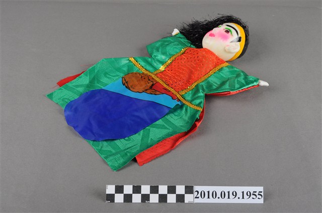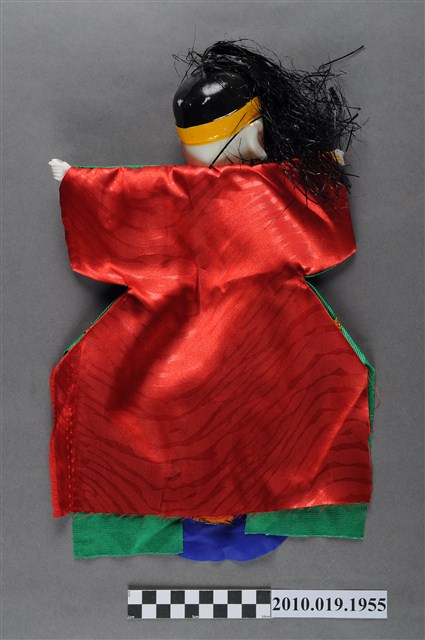 1.本物件為孫悟空布袋戲偶,濃眉大眼,並畫有淺綠色眼影,紅唇嘟起,兩頰有粉紅色腮紅,黑長髮紮成馬尾並散亂於後,頭戴橘色髮圈,身著綠色衣服,衣服中間及腰際有金色滾邊,中間為紅色布樣,下擺為藍底,背面則為紅色布樣,布偶象徵孫悟空。