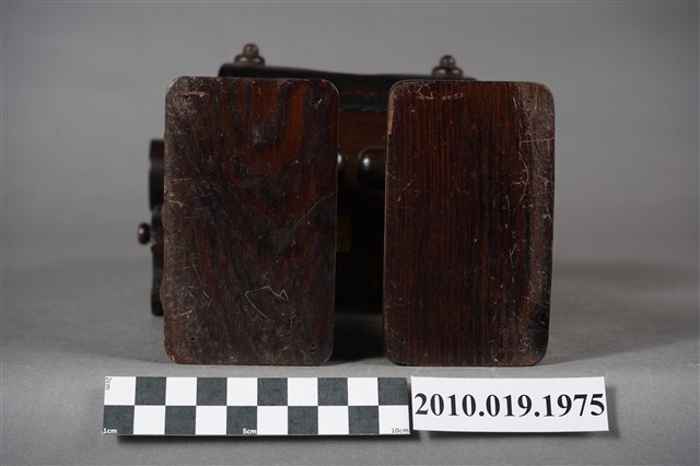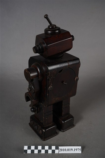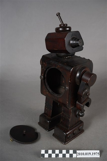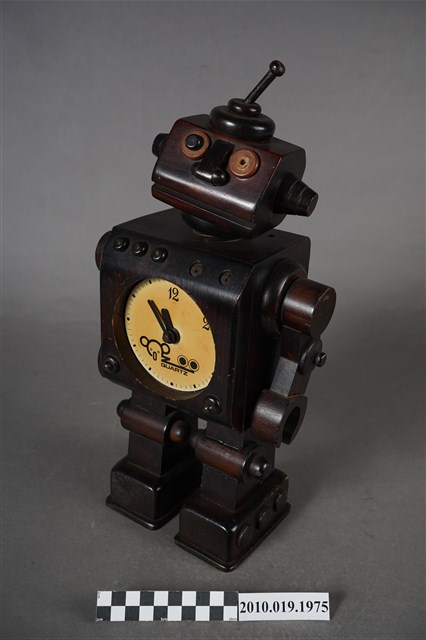 本物件為黑色機器人造型時鐘,材質為木頭,整體呈現為站立機器人造型。機器人頭頂有條天線,歪斜著頭,方型的身體中央有個時鐘,身體背後有個圓型掀蓋,打開後可調整時鐘。