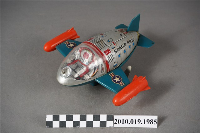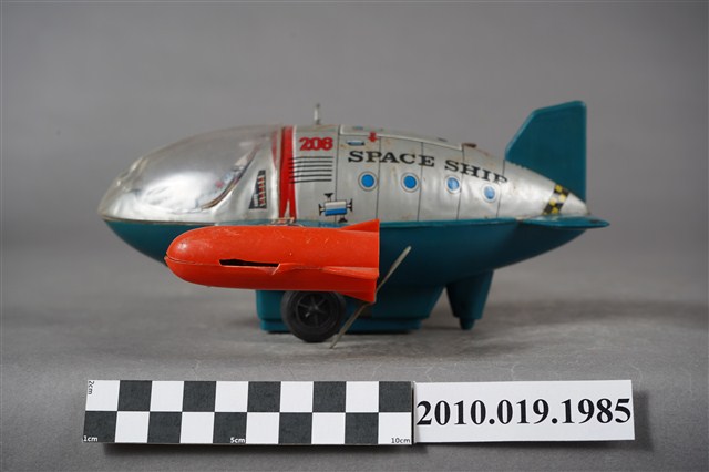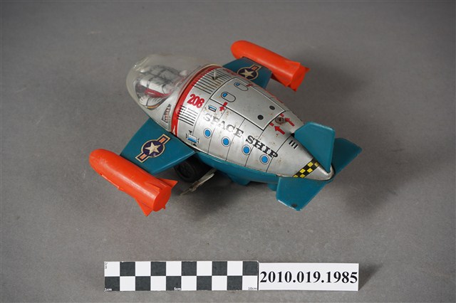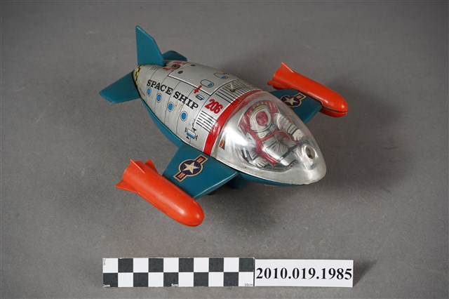 本物件為發條太空飛船,材質為塑膠與金屬,整體呈現為太空飛船的造型。太空飛船駕駛艙內坐著一名穿著NASA太空衣的飛行員,銀色的鐵皮機身上有「206」、「SPACE SHIP」字樣,機翼與機尾皆為藍色,機翼兩端各掛著一個紅色飛彈,其中一個飛彈有破損,機身有個金屬發條,機尾印有「MADE IN TAIWAN」字樣。
