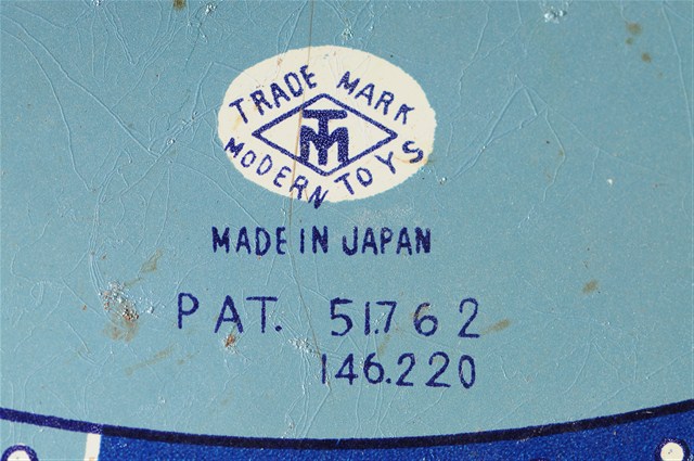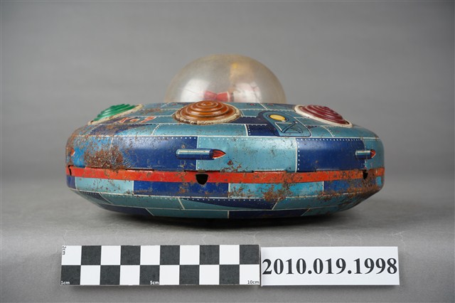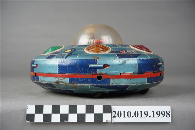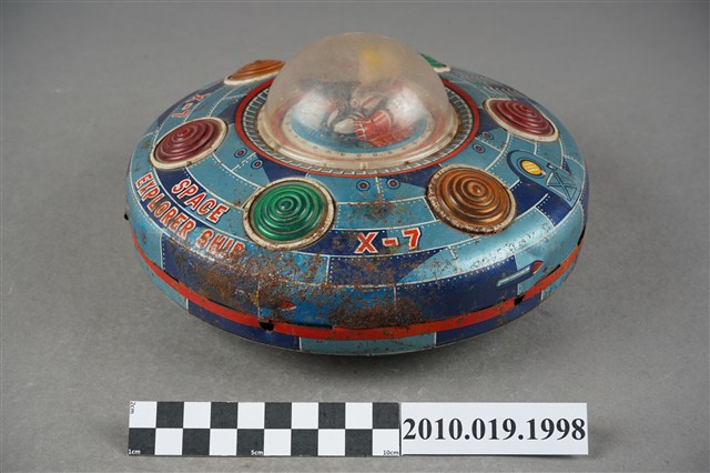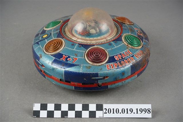 本物件為藍色圓罩X-7飛碟造型玩具,飛碟頂端有圓形的淡咖啡色防護罩,裡面有一位太空人身著紅色飛行衣,頭戴黃色飛行帽駕駛飛碟,飛碟正面有紅底黃框寫下「SPACE EXPLORER SHIP」,車身則有「X-7」字樣,飛碟上面有紅綠橘各2顆共6顆的燈,底盤有輪子還有裝置電池的設計,旁邊有玩具公司的商標,並寫下「MADE IN JAPAN」字樣。