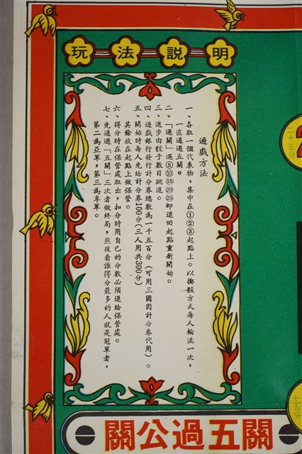 1.本物件為三國因遊戲,為長方形盒子,盒子上有1張遊戲版圖,版圖上寫黑色字體「三國因」,另外四周有三國時代的人物如關平、周倉、姜維、曹操、張遼、郭嘉等人物,遊戲版圖上寫載明遊戲規則與人物介紹,盒子上一邊畫有註冊商標,另一邊則寫明「臺北吉發文具公司」,本文物並未拆封,以一個泛黃塑膠戴套住。