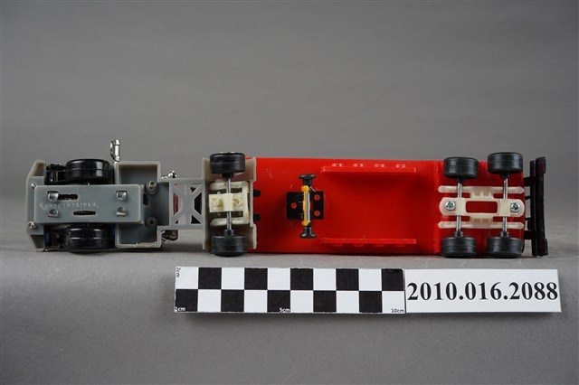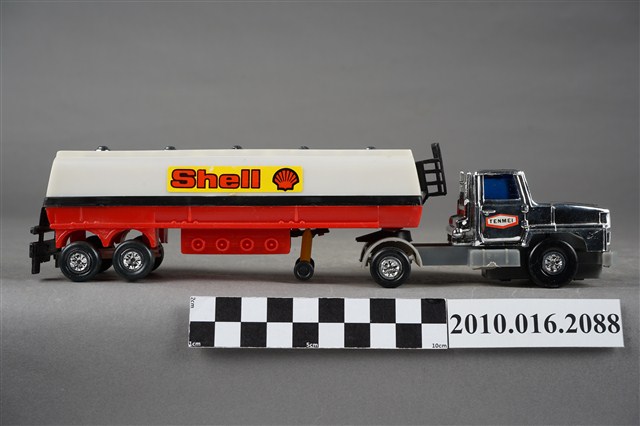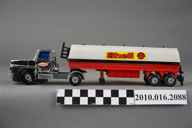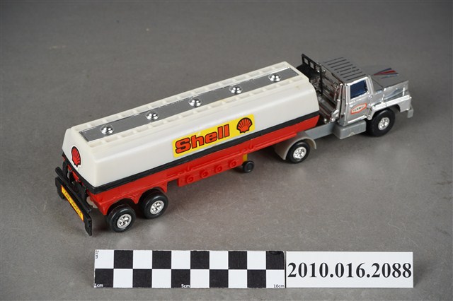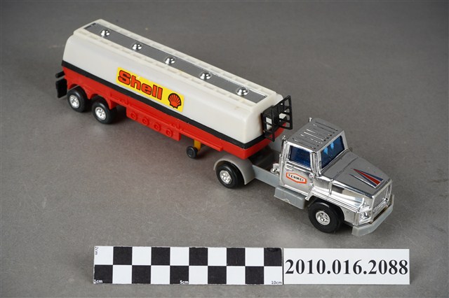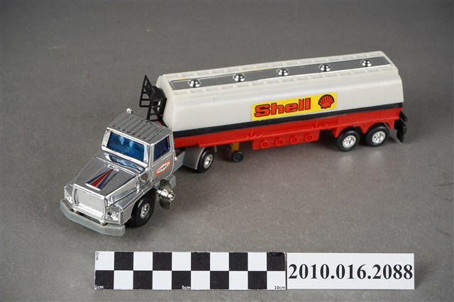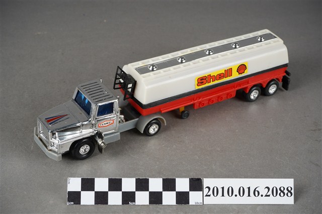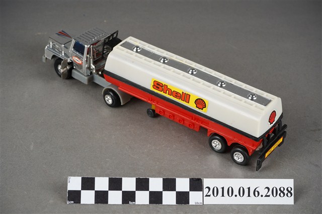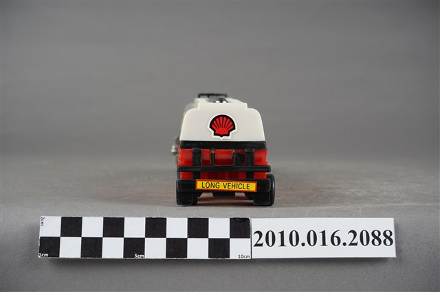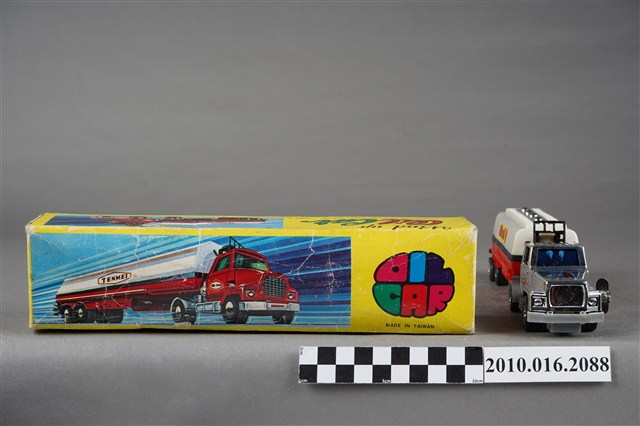 1.本物件為白色發條石油車玩具,車頭為銀色,是可轉彎車頭,兩旁窗戶為藍色,兩側車門各貼有1張白底紅框寫有「TENMEI」,車頭後方連接白色油槽,油槽側邊各貼了1張黃底紅字的「Shell」並有紅色殼牌的商標,油槽車尾端亦貼有紅色殼牌商標,油槽底盤則為紅色,整輛車共有8顆輪子,車子左側有一個銀色發條鈕,車子有一個長方形紙盒可以裝置,紙盒右側寫「OIL CAR」,下面則寫「MADE IN TAIWAN」,紙盒上有1輛與文物同樣式的車子圖案。