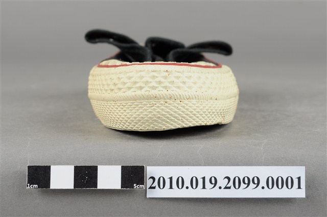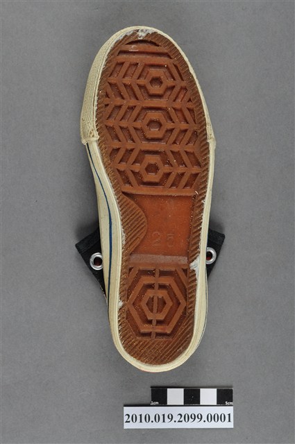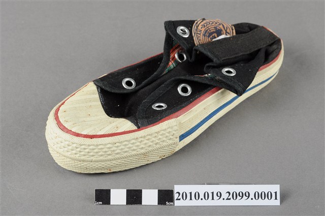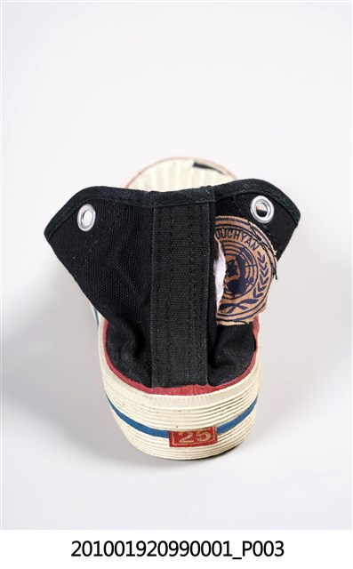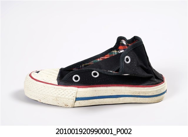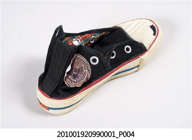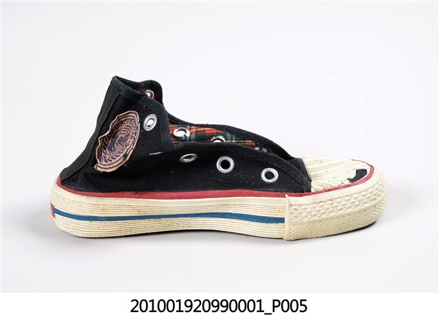1.本件為黑色高統帆布鞋之左足,外型仿照美國品牌CONVERSE經典帆布鞋款,生膠鞋底搭配黑色帆布鞋面製作,鞋內襯為蘇格蘭格紋布,鞋頭片以白色橡膠製,表面有凹凸放射狀條紋,鞋身與鞋底連接處有橡膠邊條,鞋外側接近腳踝處縫有白底圓形標籤,中間印有「強」中文字樣,鞋後跟有一紅色方型小標籤標上鞋碼「25」。2.1960年代末期,臺灣為美國代工帆布鞋而習得生產技術,而創始品牌CONVERSE早期由於政治因素無法引進臺灣,因此中國強、黑豹、成功牌等等大大小小國產品牌出現並廣受民眾歡迎,直到1980年其他進口運動鞋引進才沒落。