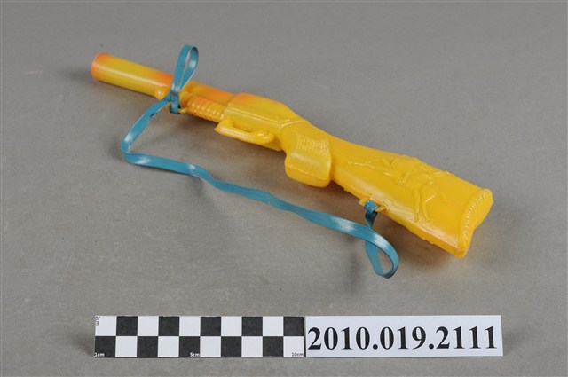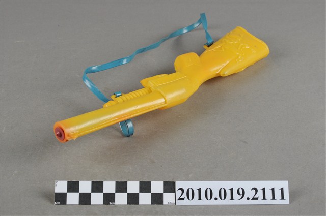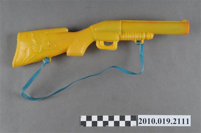 本物件為黃色塑膠玩具水槍,塑膠材質一體成型,槍托兩側處各有1人騎著馬的浮雕,槍管前面有染到些許紅色印記,槍口有1紅色塑膠片封住,塑膠片正中央則有1小洞方便出水,槍托與槍口下方各有1小洞穿過1條藍色繩子,方便揹戴。