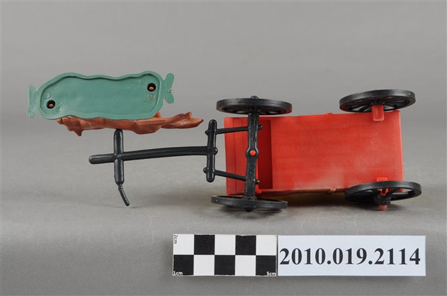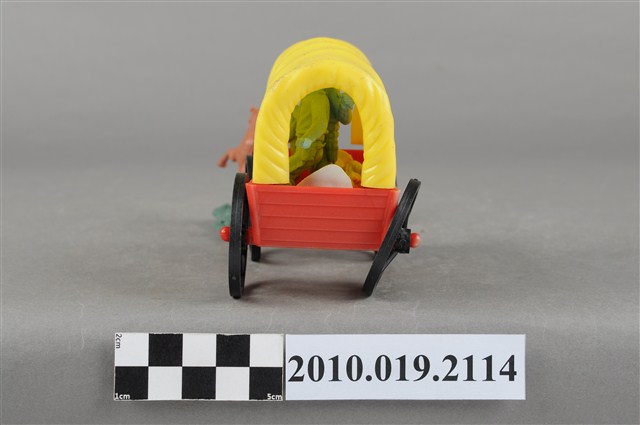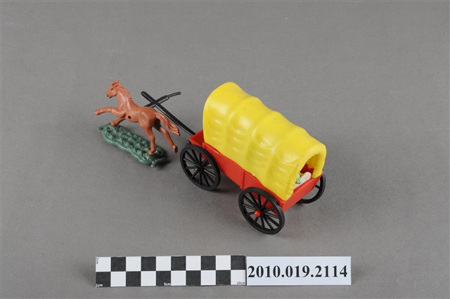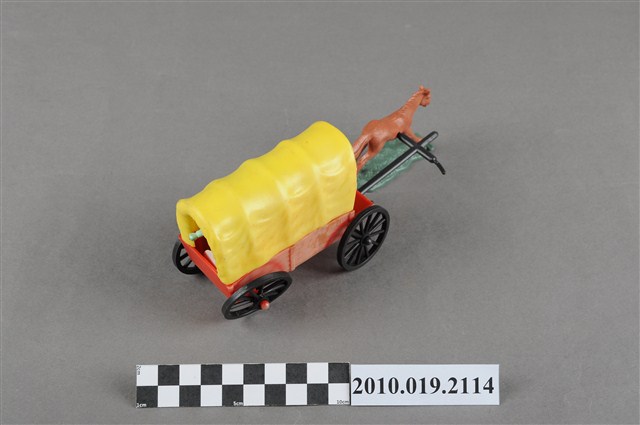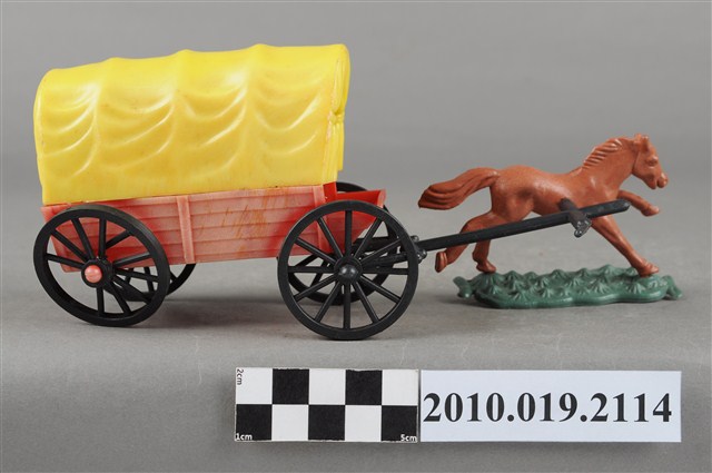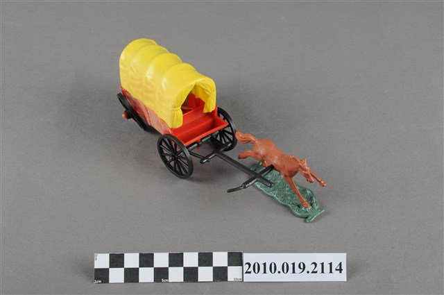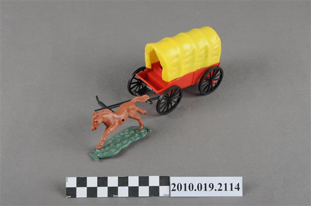 本物件為黃色塑膠玩具馬車,最前方為1匹咖啡色的馬,塑膠材質一體成型,底做為綠色塑膠片,馬的姿勢向前奔跑,馬尾亦微微飄揚,馬身左側有1圓形小洞,可以穿過軛衡,馬車衡軛為黑色,後方連接1臺黃蓋馬車,底座為紅色,馬車內有數人,馬車右後輪傾斜向內。