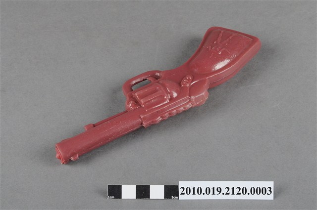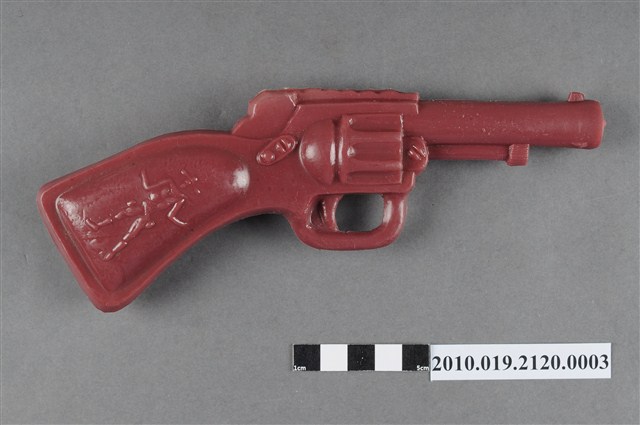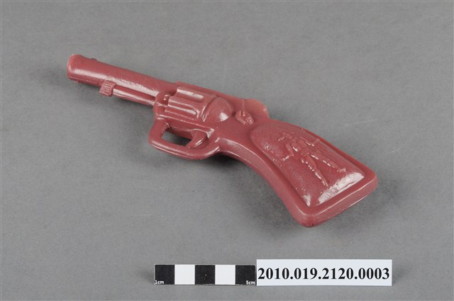 本物件為咖啡色手槍造型玩具,顏色為咖啡色,整把槍皆為塑膠製品一體成形,在槍身上都有做出彈筒、扳機圖形,以及握柄上都有牛仔圖案。