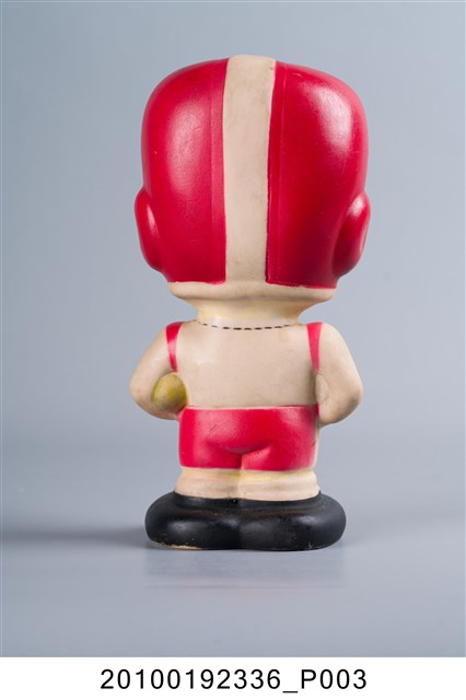 1.本物件為塑膠製54號大同寶寶存錢筒,頭上戴著紅白相間的頭盔,印著「大同公司」、「TATUNG」等文字和圖案組成的標章,左手抱著橄欖球,右手插腰,運動服裝前面也有藍綠色「54」的字樣,服裝背面則為無邊號。底部刻有「紅藍公司承製」,及該公司電話號碼。