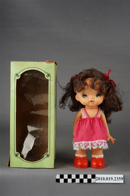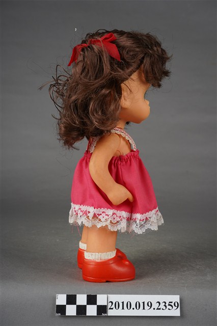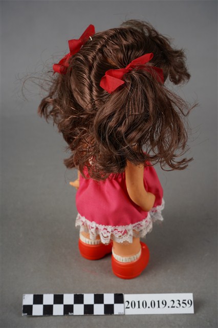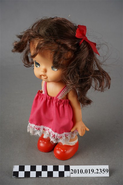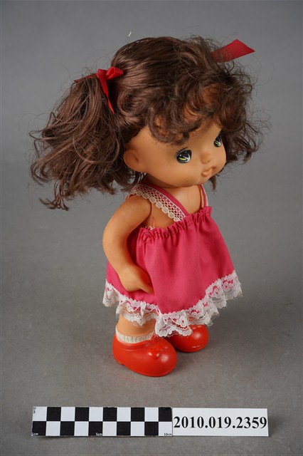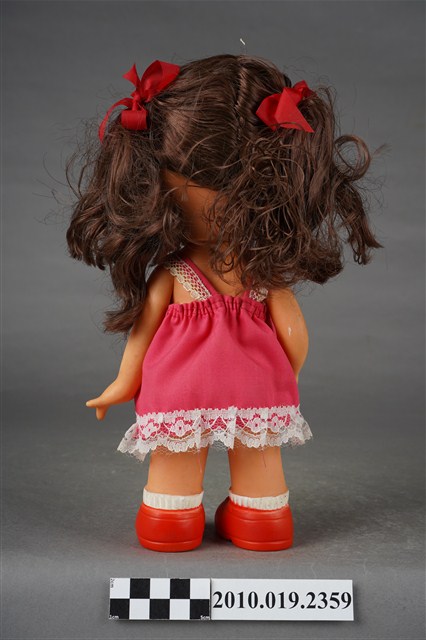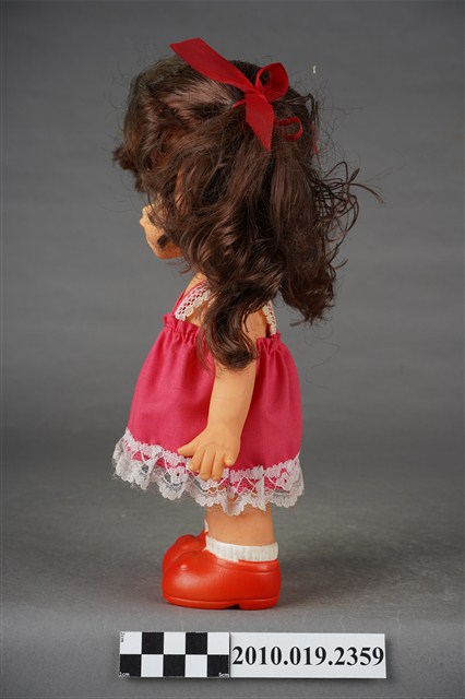 本物件為瑪麗女孩玩偶,眼睛為黑色帶有白黃相間,頭髮為棕色長髮繫頭髮,兩側綁有紅色蝴蝶結,身著桃紅色蕾絲鑲邊洋裝,兩腳穿著白色襪子與紅鞋呈站立姿勢。